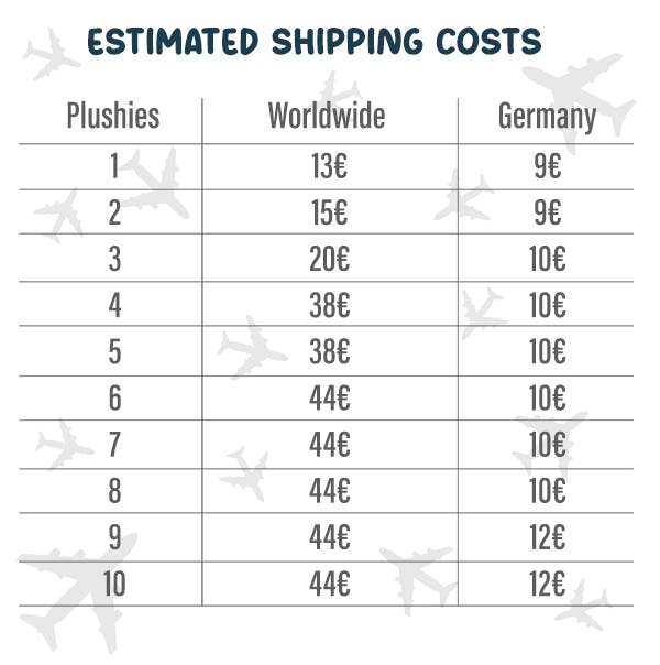 Your shipping costs will depend on if you live within or outside of Germany, the amount of plushies, the packages final size and weight. Below you can see a calculation of what your shipping costs are going to be. It´s only calculated for up to 10 plushies, if you want to go all wild though and order way more, you can calculate 8€ more per 2 more plushies for worldwide shipping. Shipping will roughly be charged by June-July when mass production is about to start.