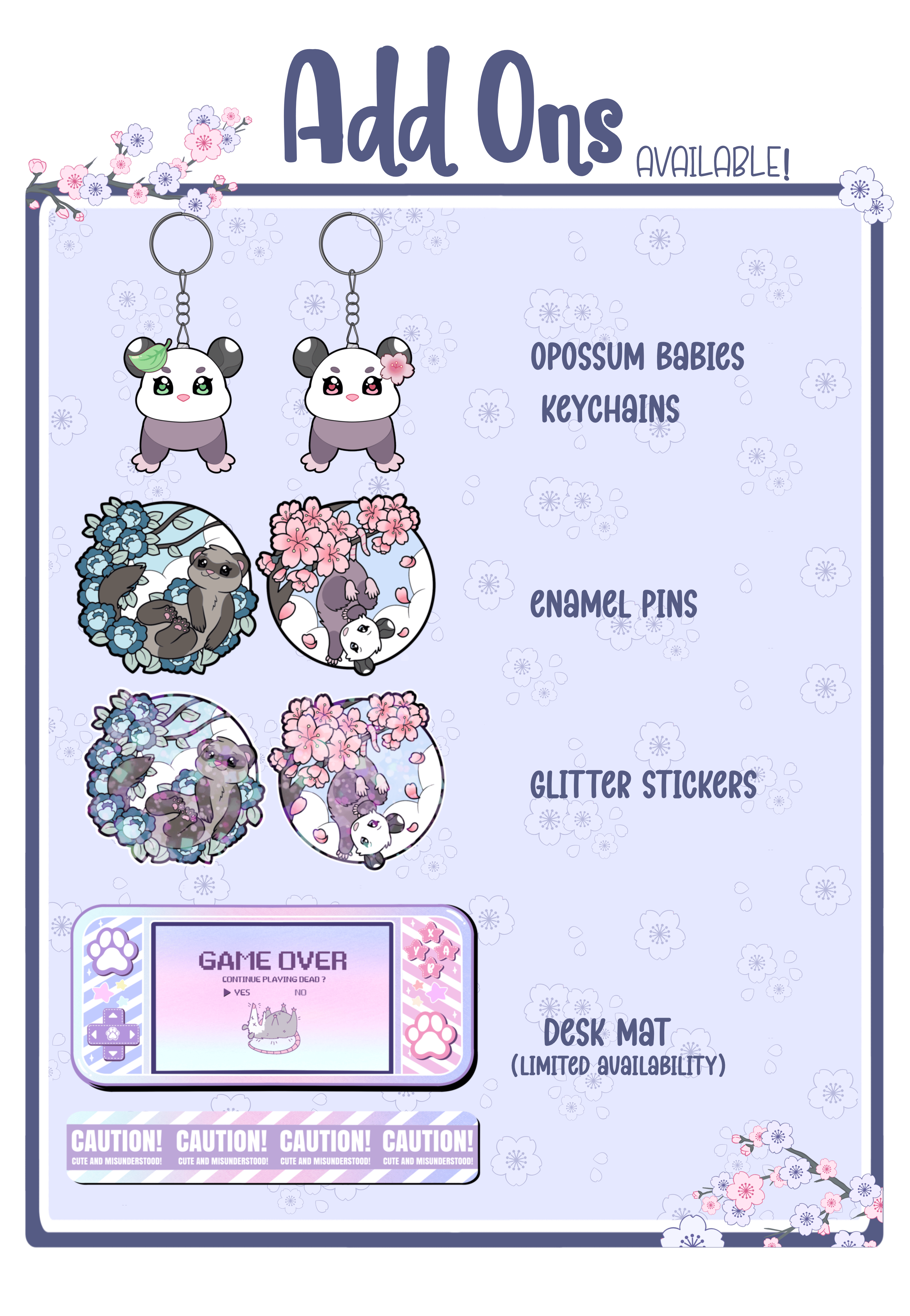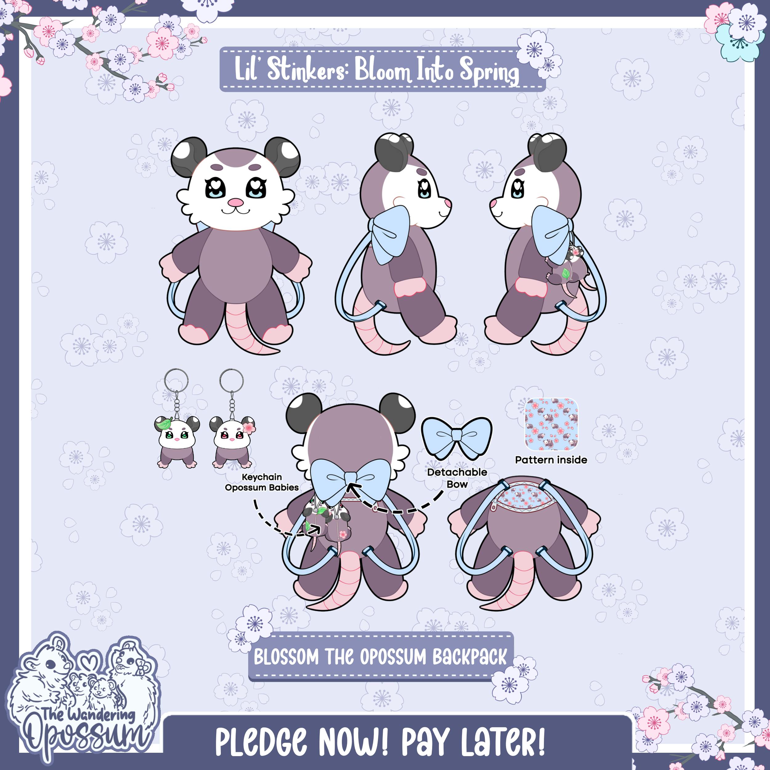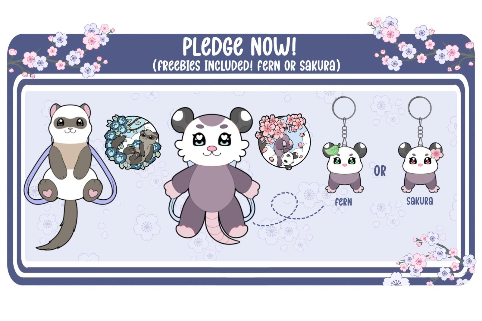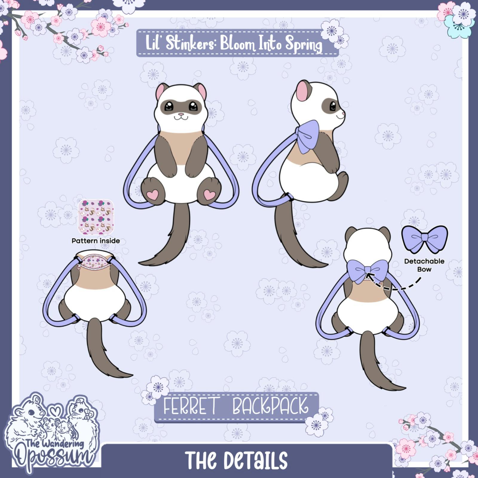 โ Opossum Premium Enamel Pin โ Blossom the Opossum Backpack โ Opossum Shopping Bag (New) โ Sakura & Fern Opossum Babies Keychains โ Ferret Premium Enamel Pin โ Ferguson the Ferret Backpack โ Ferret Shopping Bag (New) (Keychains are add-ons or offered as a freebie.)