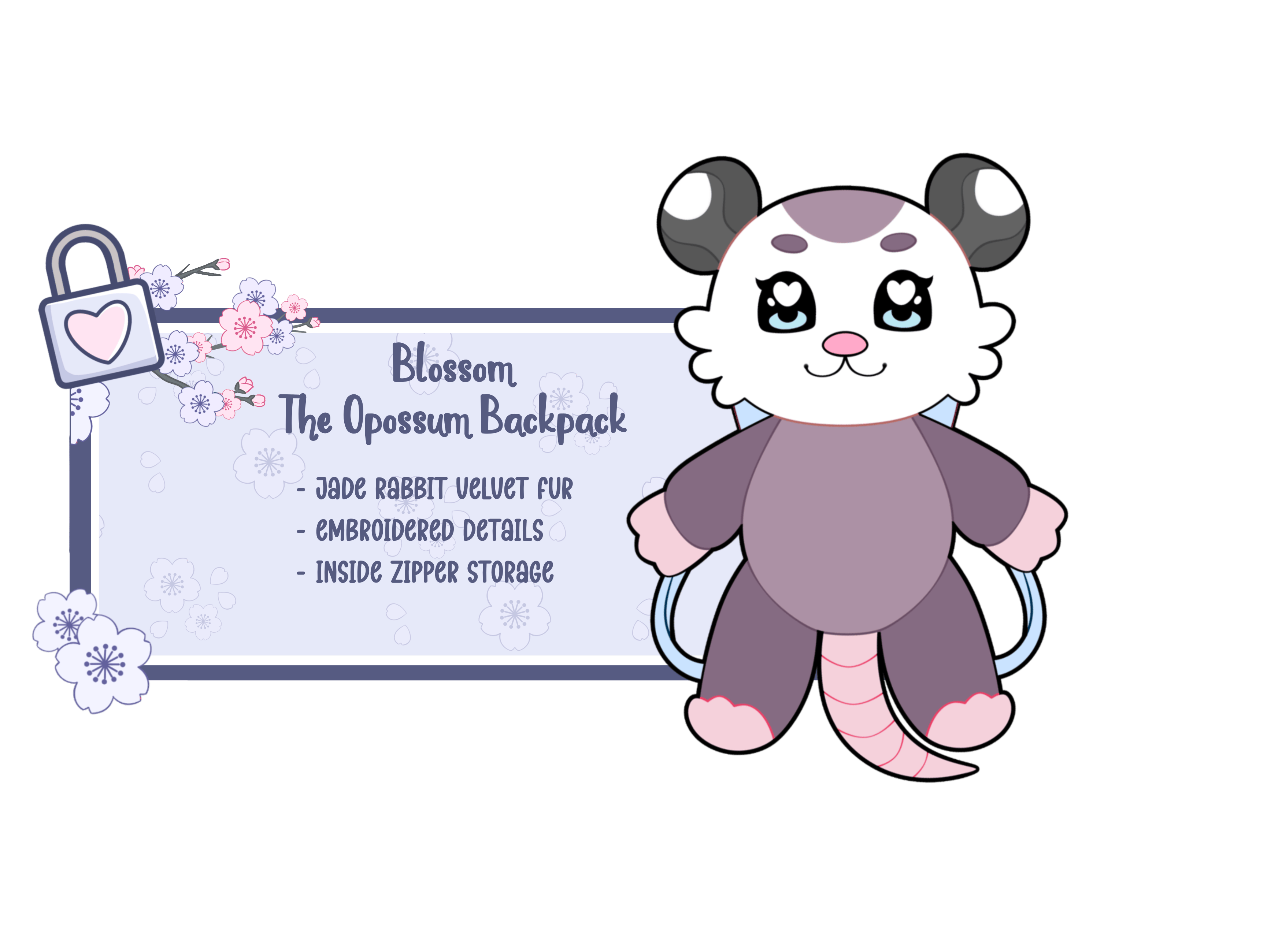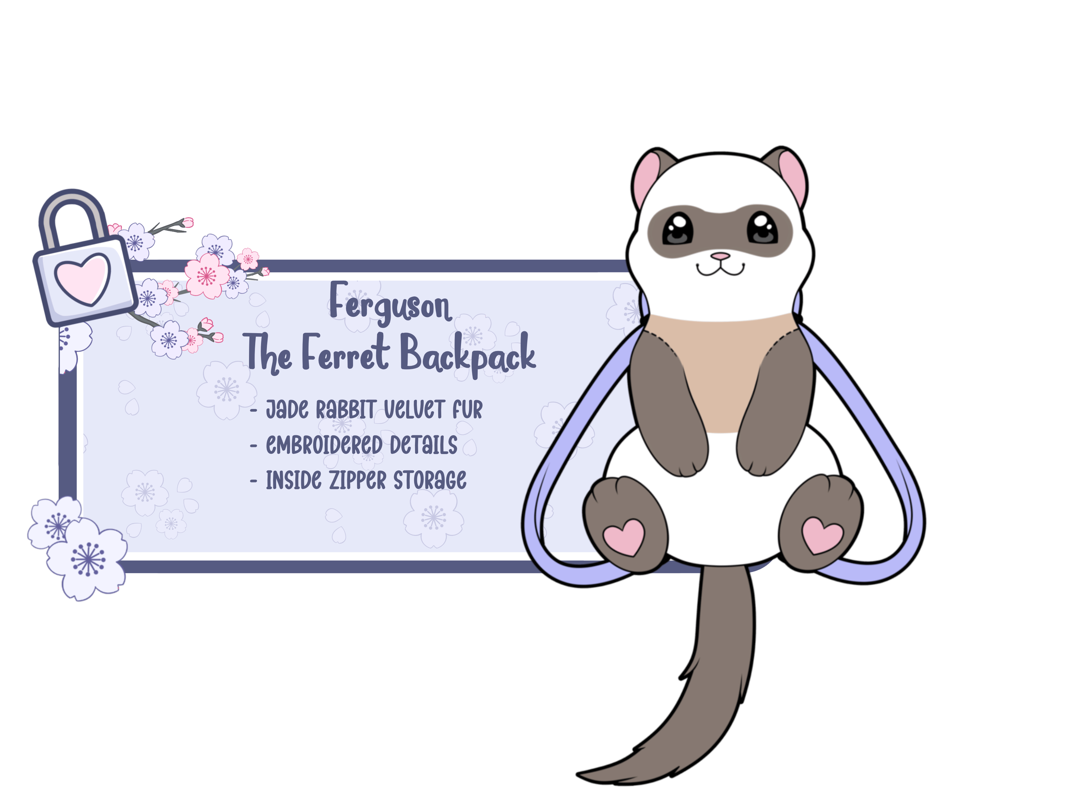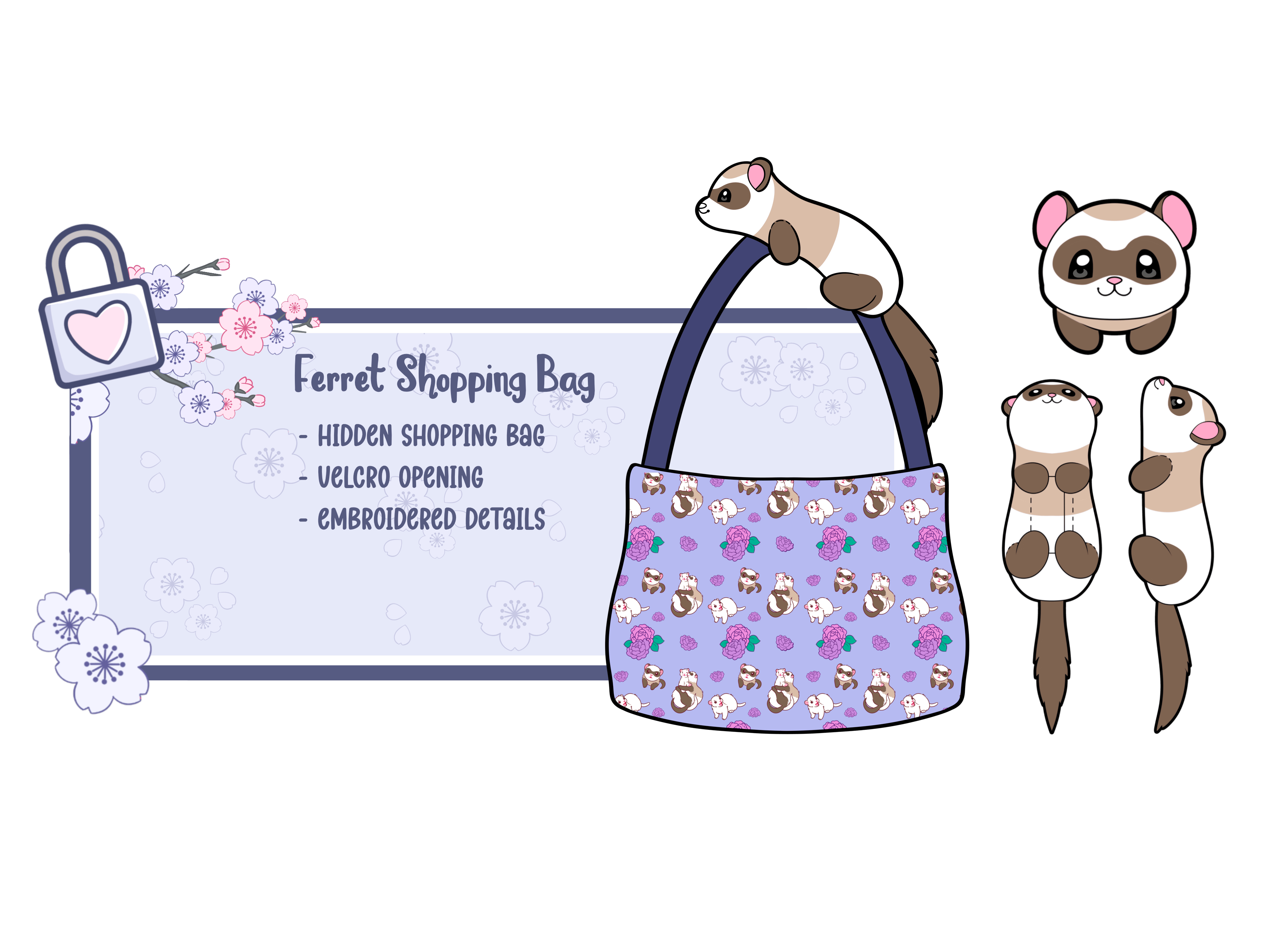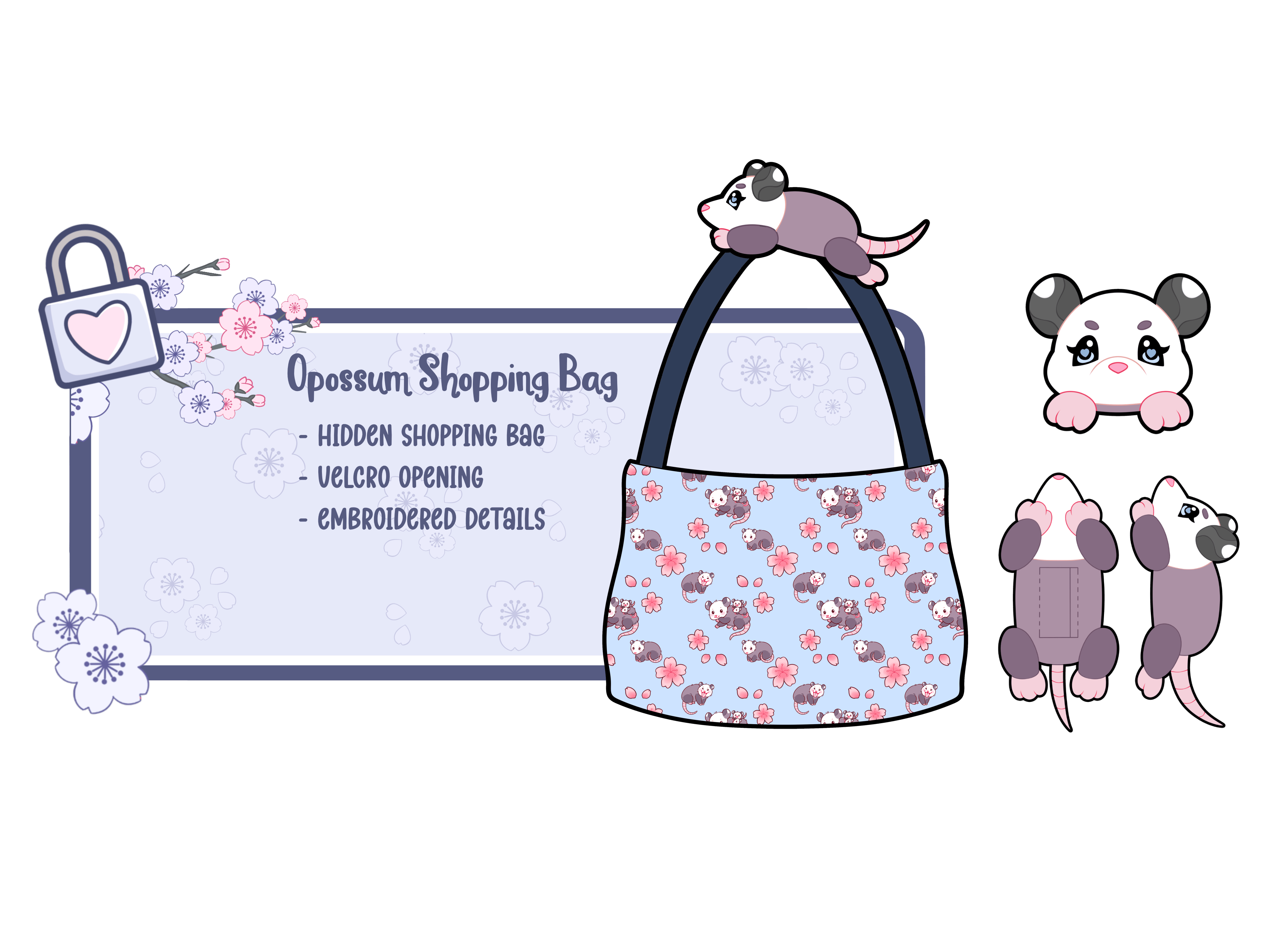 โ Opossum Premium Enamel Pin โ Blossom the Opossum Backpack โ Opossum Shopping Bag (New) โ Sakura & Fern Opossum Babies Keychains โ Ferret Premium Enamel Pin โ Ferguson the Ferret Backpack โ Ferret Shopping Bag (New) (Keychains are add-ons or offered as a freebie.)
