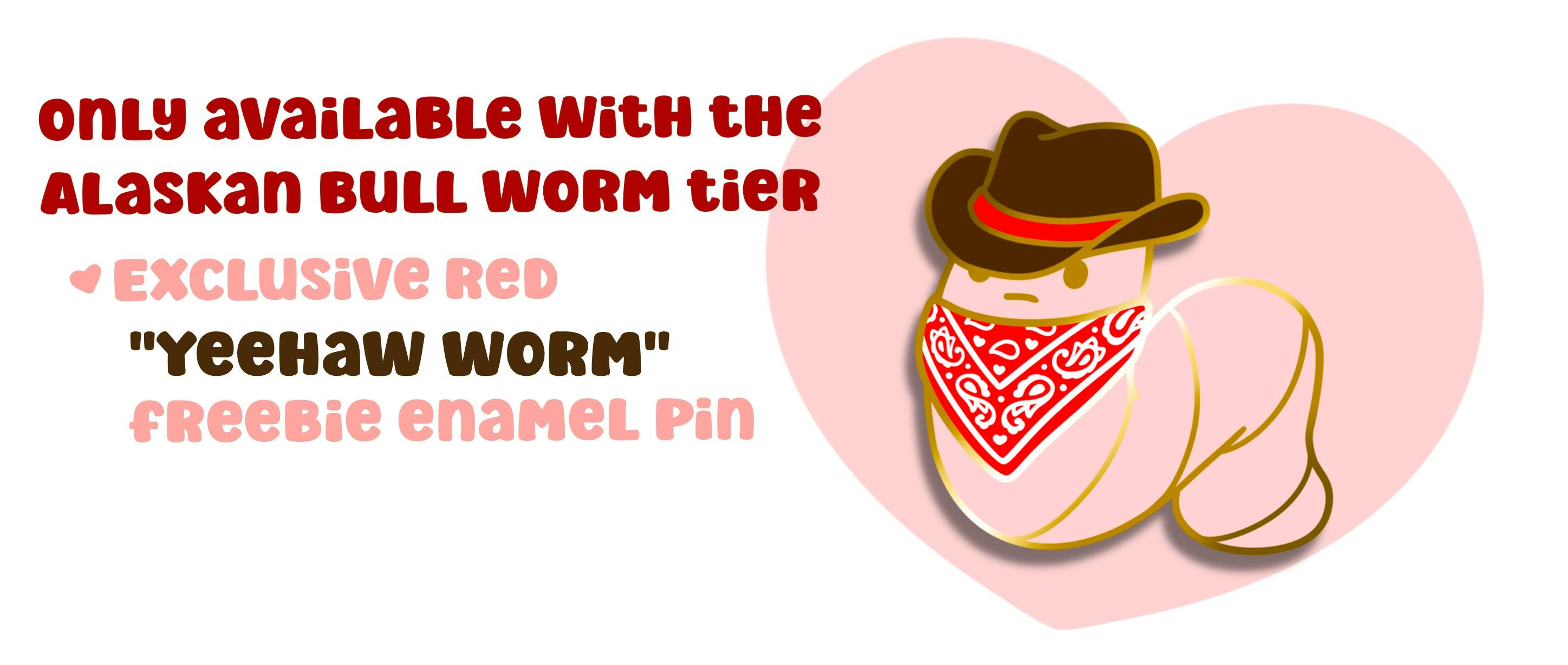 I'm also offering an EXCLUSIVE Yeehaw Worm pin in a red colorway. This freebie is only available with the Alaskan Bull Worm reward tier. This variant is not available for purchase during or after the campaign.