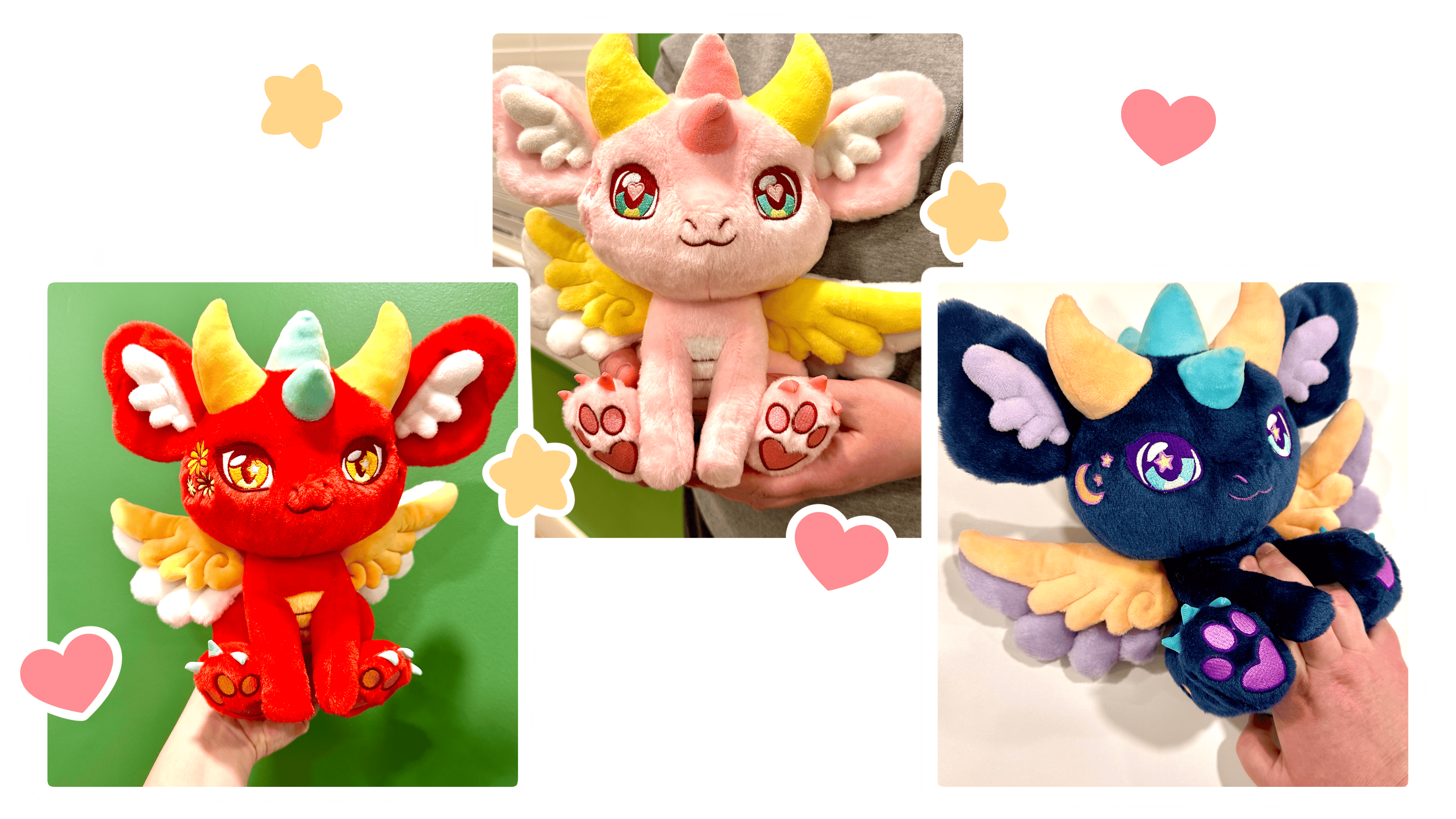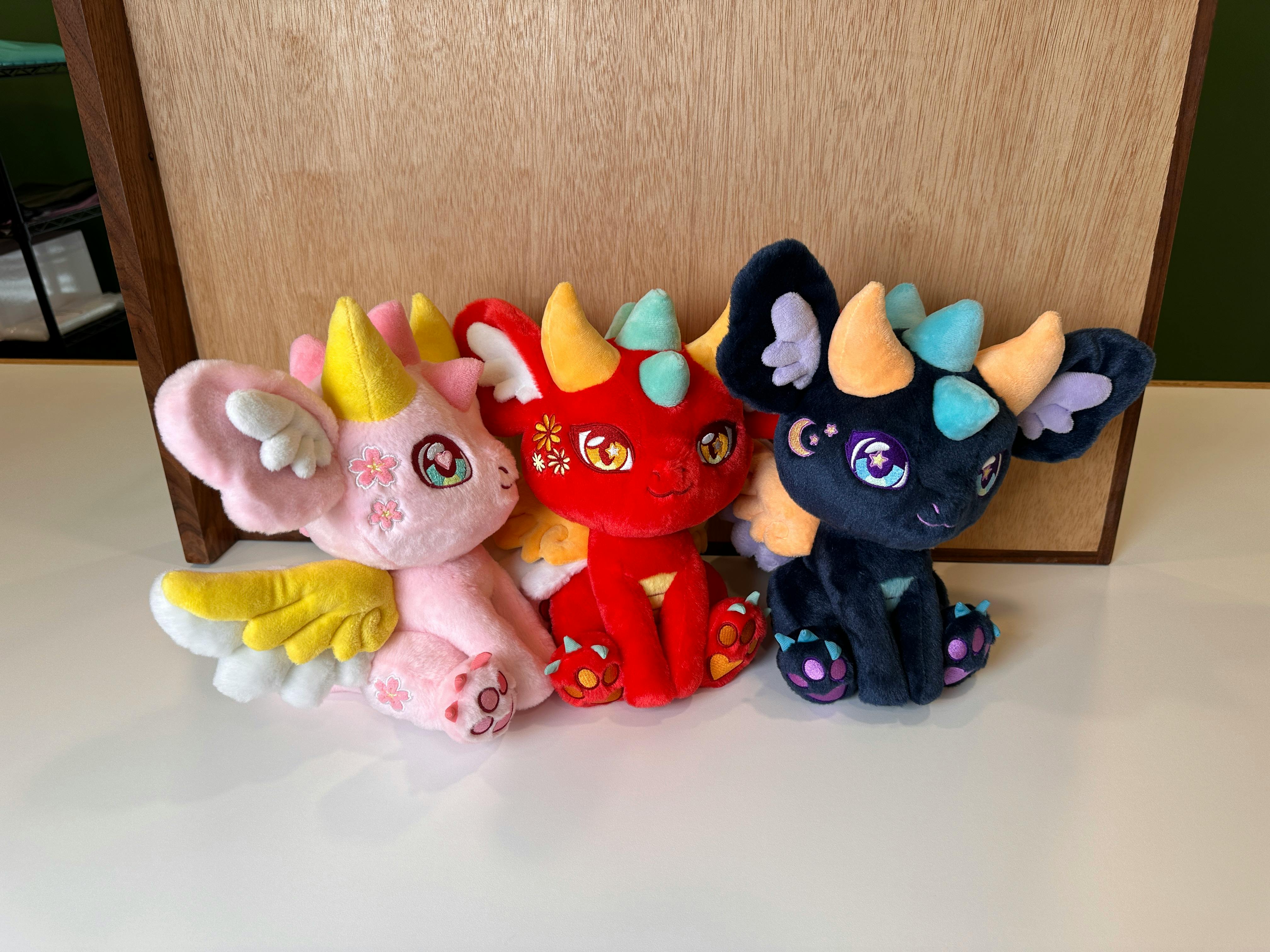 Each Dragon character will have it's own unique theme and colors, as well as different eyes and embroidery designs! This campaign goal is to manufacturer Ella the Sakura Dragon, Calypso the Celestial Dragon, and Ryu the Chinese New Year Dragon!
