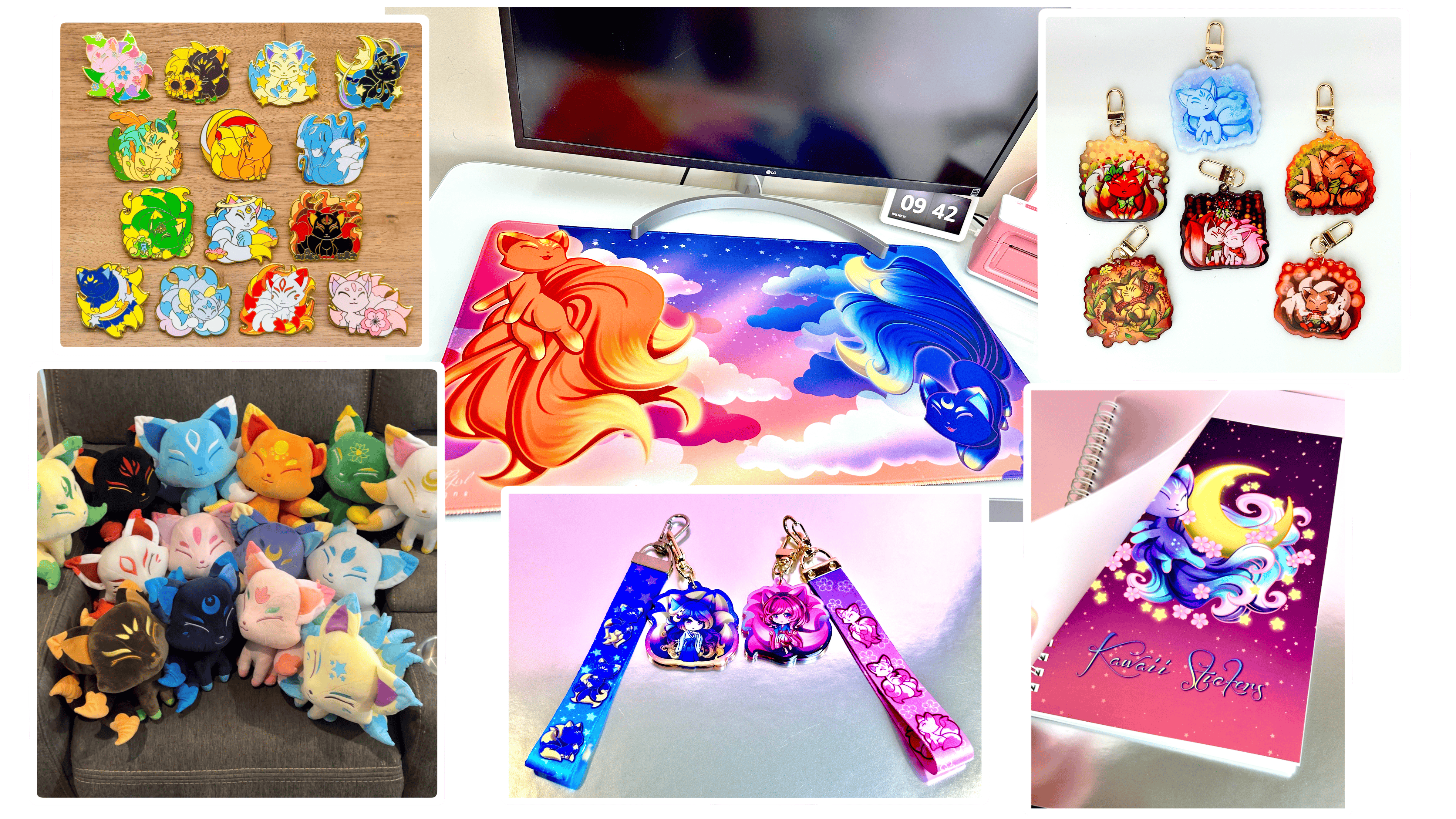 The main subject of my art is nine-tailed kitsunes! I have created 14 different characters, all unique themes and colors, and I have made them into plushies! I sell many other things too, like keychains, enamel pins, stickers, lanyards, ETC!