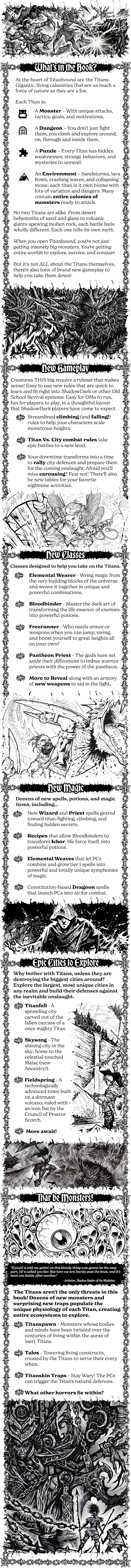 Titanbound is a fantasy RPG sourcebook, 100% compatible with ShadowDark RPG. It blends classic dungeon-crawl danger with vertical travel mechanics, "point-climb" gameplay, and the epic feel of hunting titanic, unstoppable monsters.