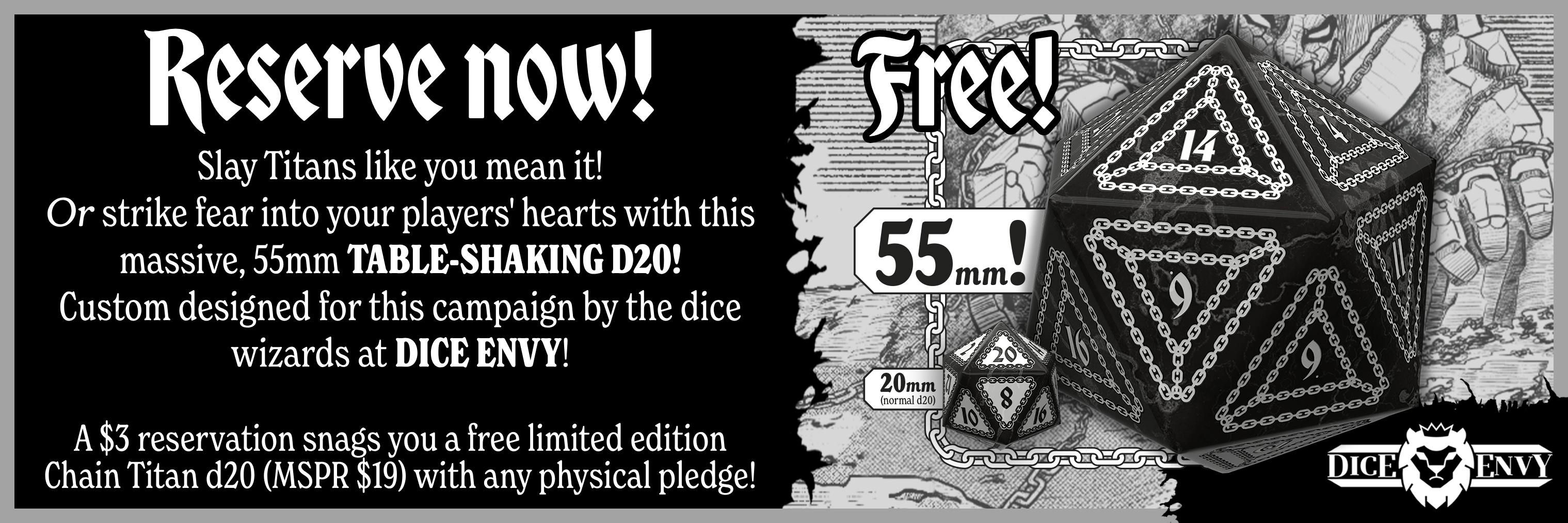 - Follow and Reserve your pledge and get the massively titanic, custom-designed Chained Titan d20 (MSRP $19), designed by Rach Ferrell and the dice wizards at Dice Envy!