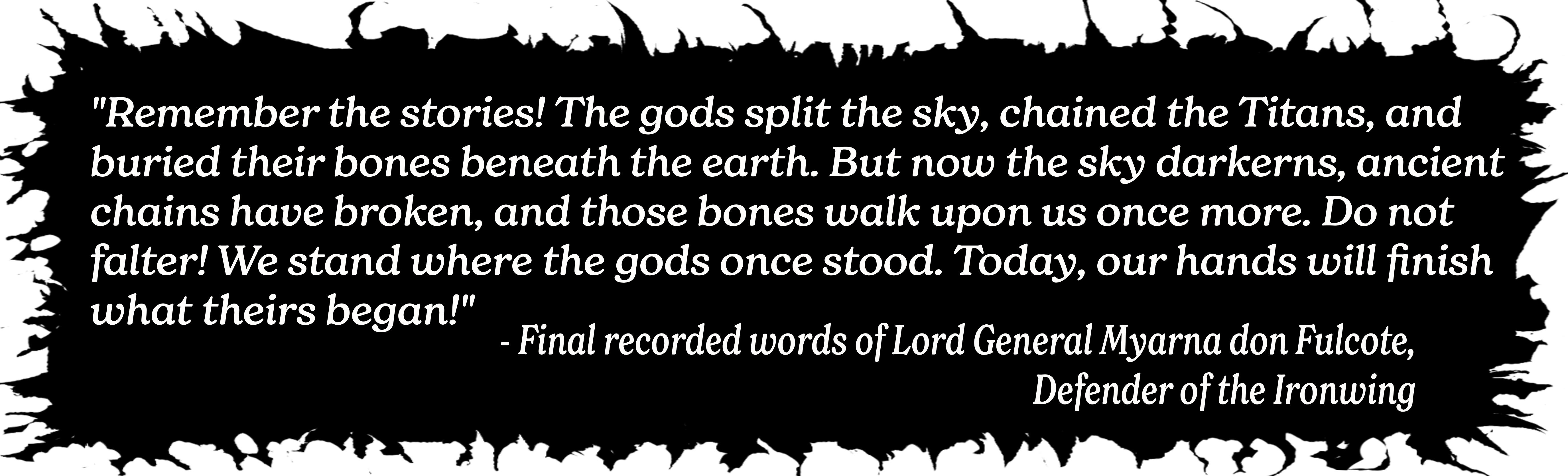 After creating the world, the Titans gave birth to the gods. The gods rebelled and struck down the Titans. Their bones became mountains, their blood carved canyons. For centuries, both mortals and the gods believed the Titans vanquished. But now the Titans rise again. Colossal, living maelstroms that stride across the land, bringing ruin wherever they roam.