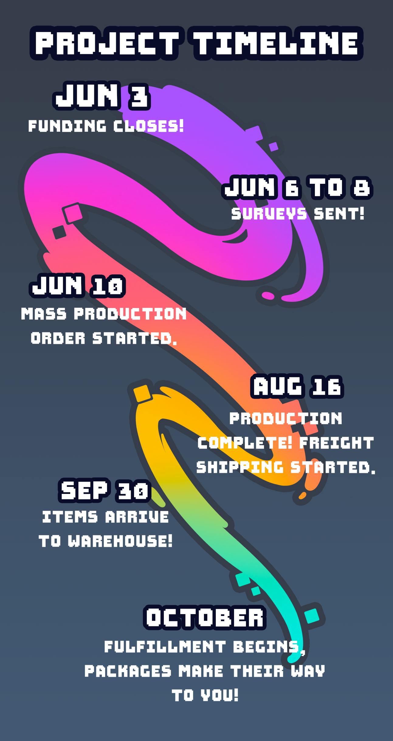 Please note that this is an ESTIMATED timeline based on my experiences with past projects of similar scale. October is the estimated beginning of fulfillment meaning that that is when packages can be expected to start shipping. In the case you need to change a receiving address in that time, please send those inquiries to [email protected]!