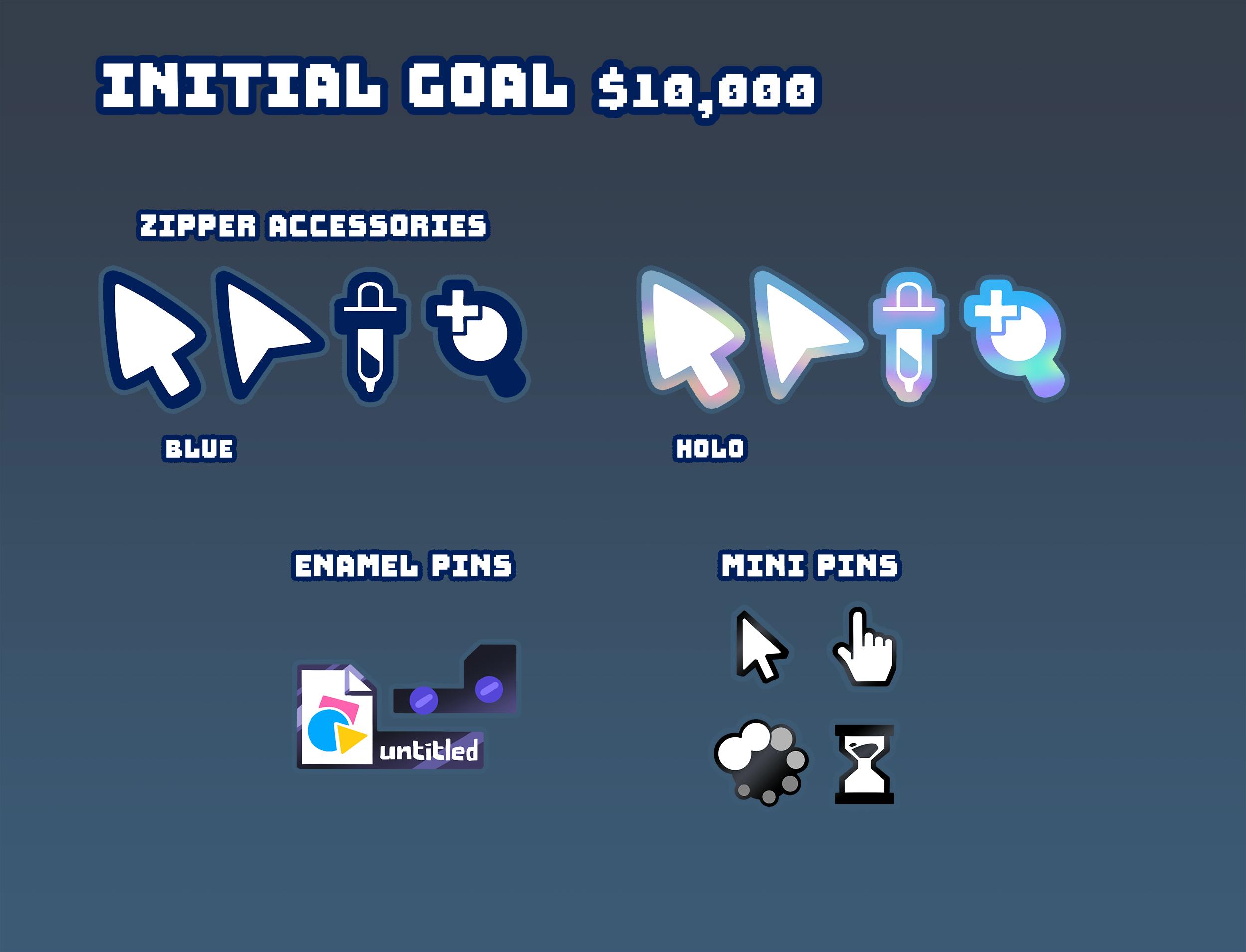 Zipper Accessories Zipper accessories are available as an add-on item. The zippers on either MX Paint bag are fully functional without the additional accessories but these can be purchased to add some more digital tools to your untitled canvas. Zippers accessories come in either dark blue or holographic pleather, they are 2 inches long, and they clip on using a small lobster clasp. The current versions in the photos are single-sided print but the ones offered in this campaign will be double-sided. Future colorways may be added to match stretch goal colors of the bag.