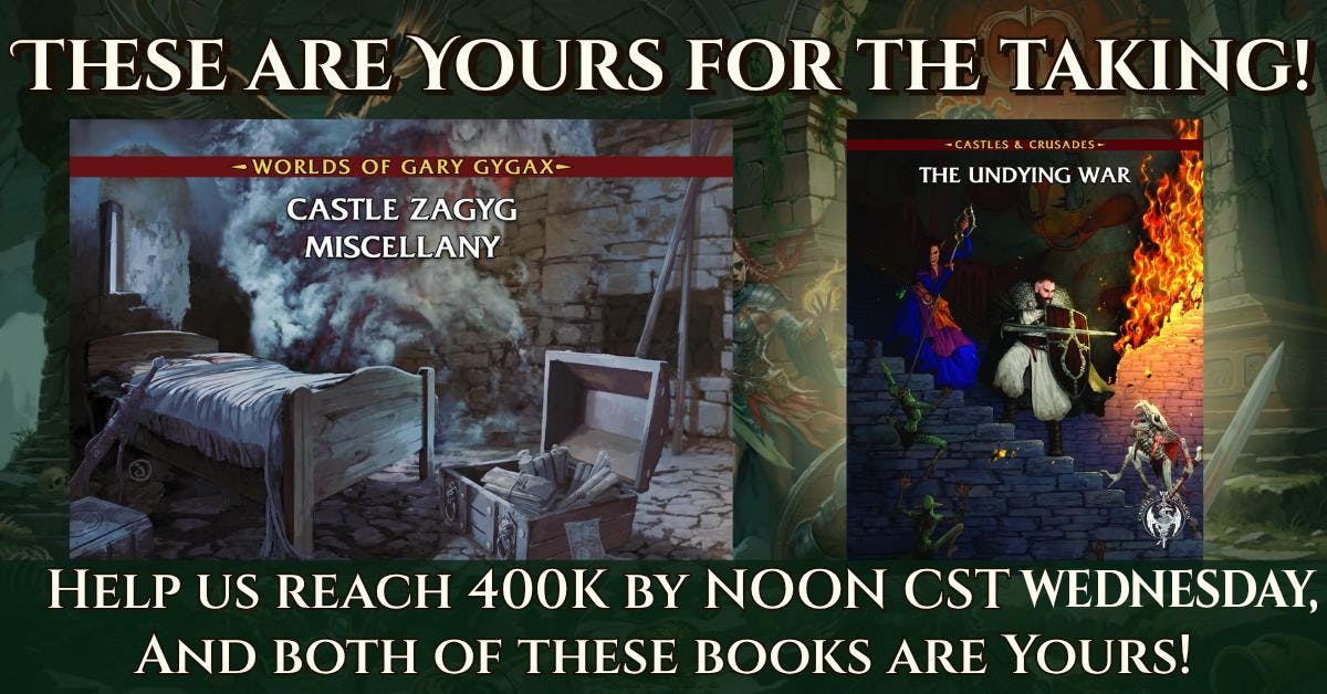 **BONUS REWARD! If we hit $400,000 by 12 NOON CST Wednesday not only will you receive Gary Gygax's Miscellany #1 but we'll send you all, EVERY. ONE. OF. YOU. a digital copy of The Undying War, a massive campaign and adventure path for Castles & Crusades