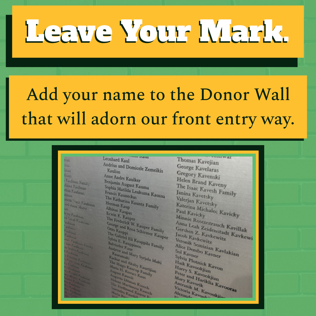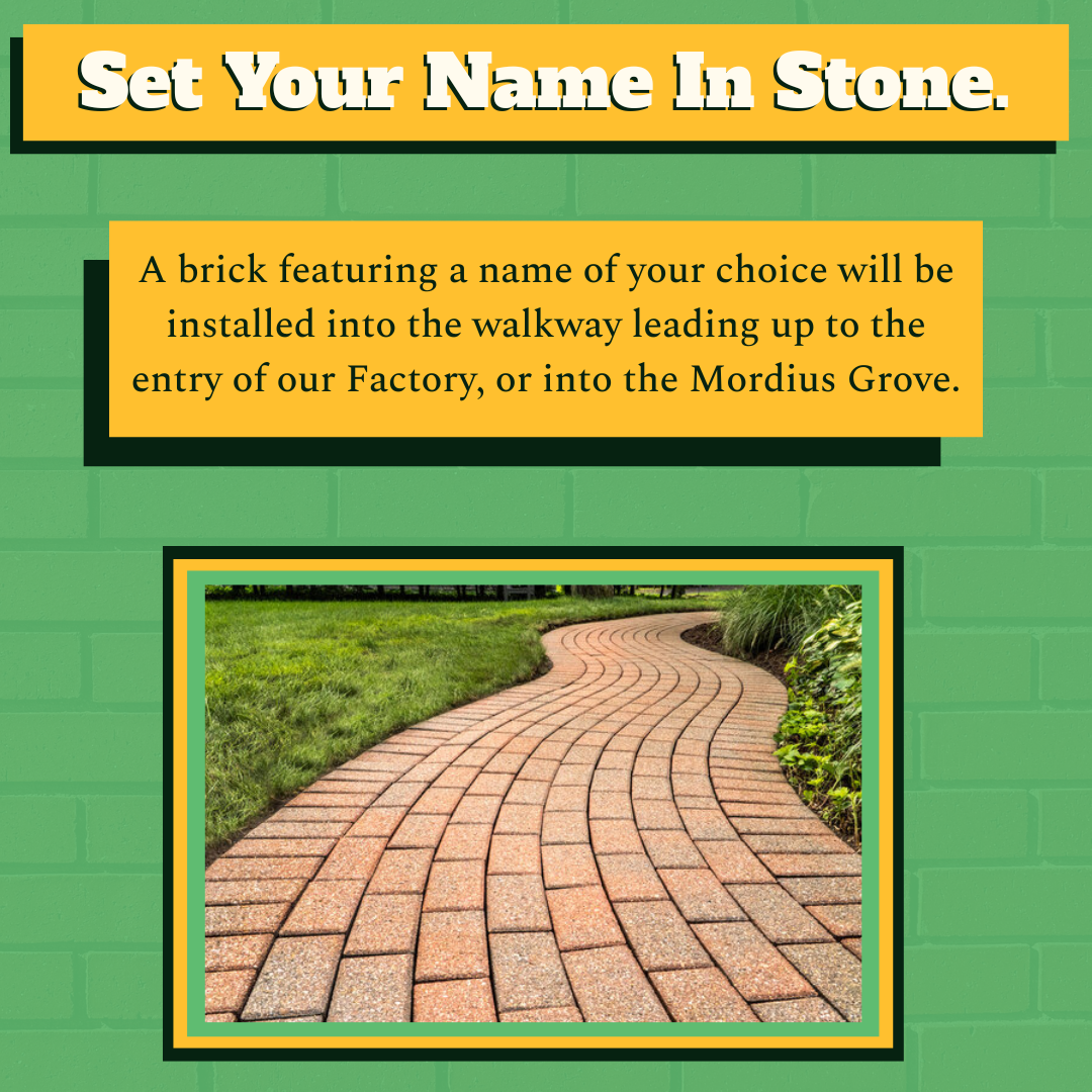 With an investment as small as $25 or as grand as $2,500, you'll leave a permanent mark on the Factory with your name on The Wall of Names, The Mason's Path, or in Mordius's Grove. Your names will serve as a constant reminder of all those who have helped us make this possible.