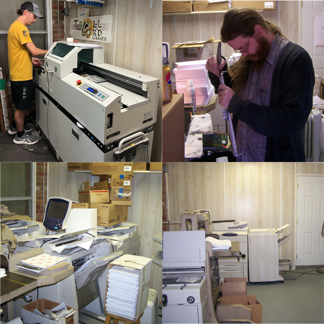 Troll Lord Games has been in the TTRPG and Fiction publishing business since 1999. We added a print shop to our operation in 2005, allowing us to print most of our softcover books in-house. We've done this in small detached print shops, which are often cramped and difficult to navigate. Despite this, the print shop has been in continual operation for 20 years. Our current print master is Dakota McMurry.