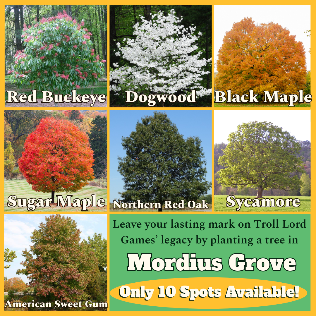 Help us give back to the land. In the back corner of the TLG property, we have planned to build a small grove. There, we’ll plant 10 trees, along with native shrubs and grass, and a small walking path and whatever else Davis Chenault decides. You can choose one of the trees from the list below, and as supplies allow, we’ll have the tree professionally planted. The tree purchased will be a sapling, 6-10 feet tall. Your investment not only purchases the tree but also includes your name, your favorite character's name, or your store, convention, or company name immortalized on a plaque set before the tree in the Grove of Mordius.