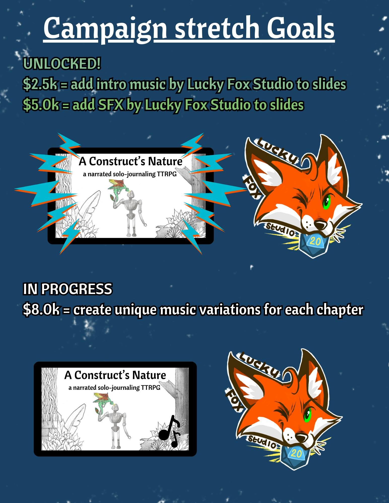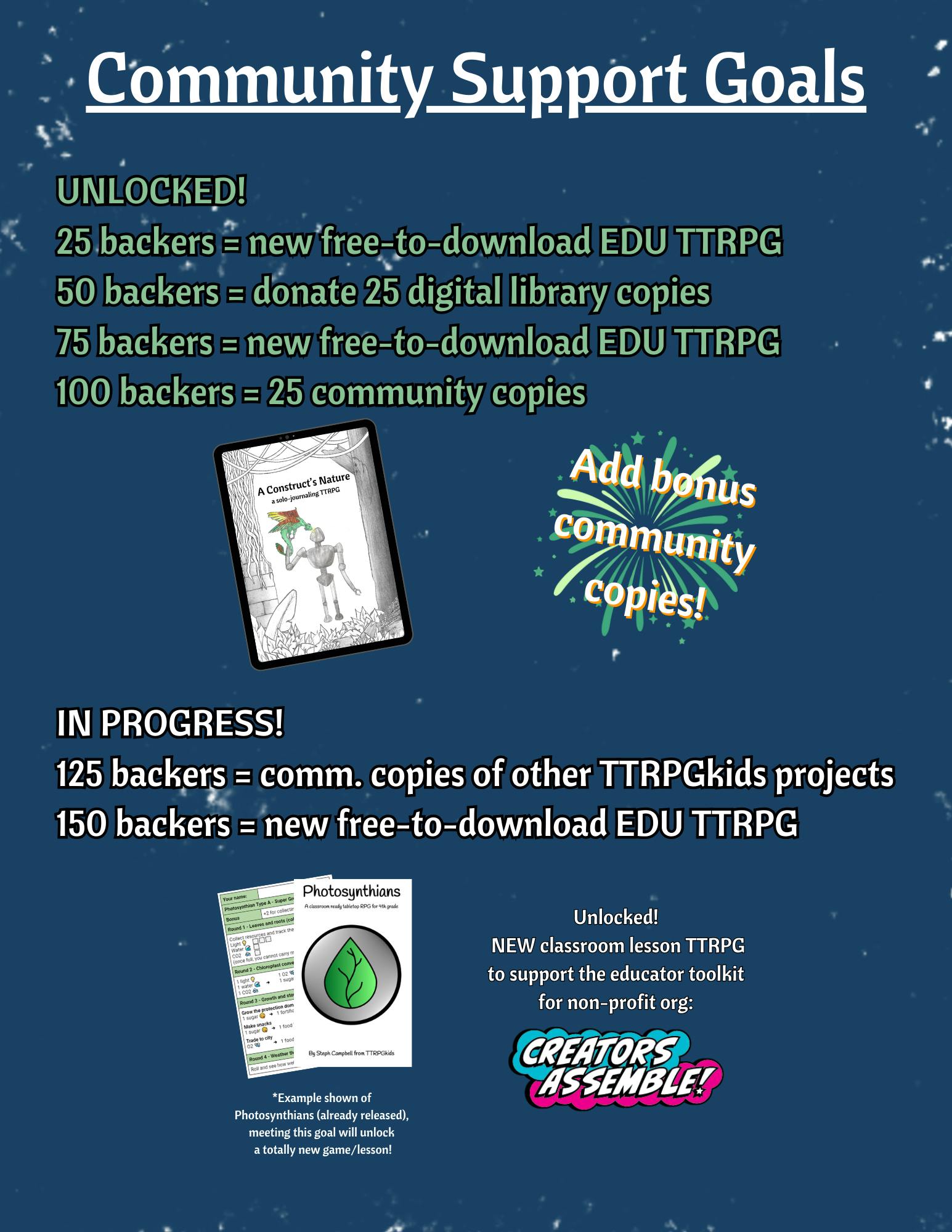 I am making A Construct's Nature with the intention of having it be classroom accessible, and I also want to support additional work in classroom TTRPG development. Sponsoring a game will fund my writing a classroom-ready TTRPG in alignment with curriculum guides from Creators, Assemble! that I and gives you the opportunity to help influence where that game goes in addition to you being credited as the sponsor and choosing the game's dedication.