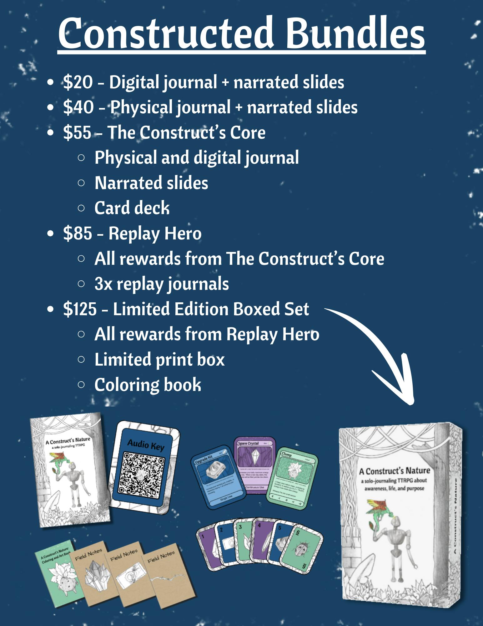 A Construct's Nature is an audio narrated solo-journaling TTRPG following the path of a newly awakened being in an overgrown world sparked with magic as they solve the land's mysteries, find connection with others, and discover their purpose.