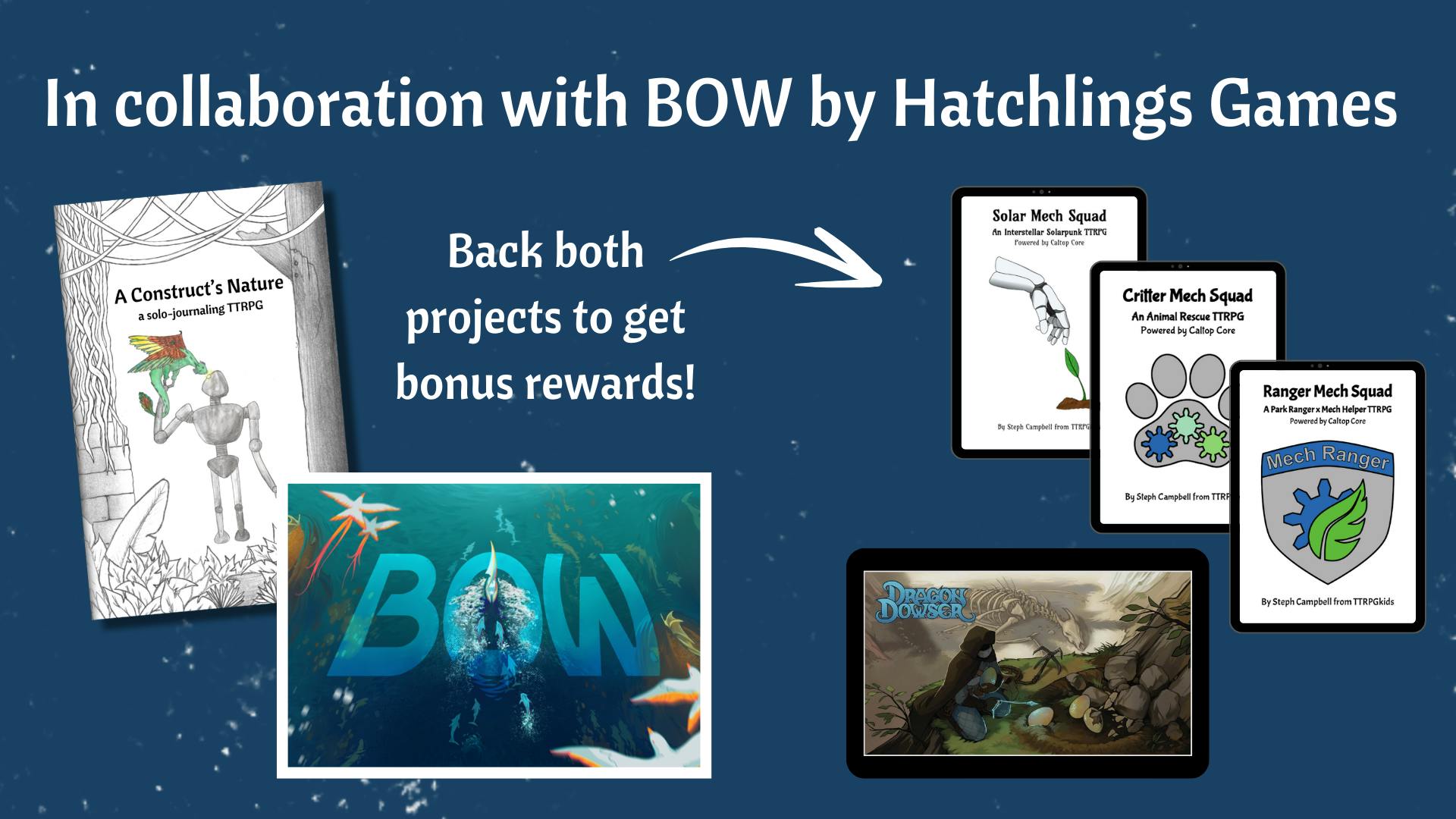 We've launched our projects on the same day, and if you back both of our games at the physical tier or higher, you'll get a set of free digital game copies from some of our other works! This includes Solar Mech Squad, Critter Mech Squad, and Ranger Mech Squad from TTRPGkids and Dragon Dowser from Hatchlings Games!