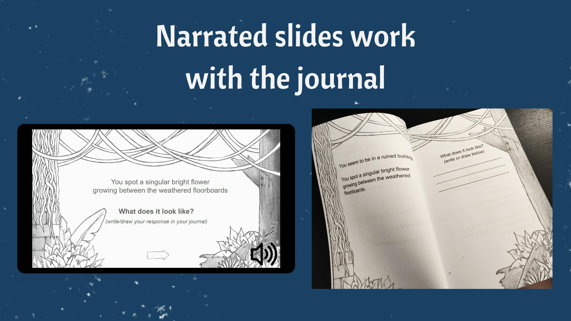 The main goal for this campaign is to fund audio narration (and music/SFX through stretch goals) for slides that align with the journal, allowing you to easily click through prompts and giving opportunities for incorportaing immersive visual and audio affects with the experience.