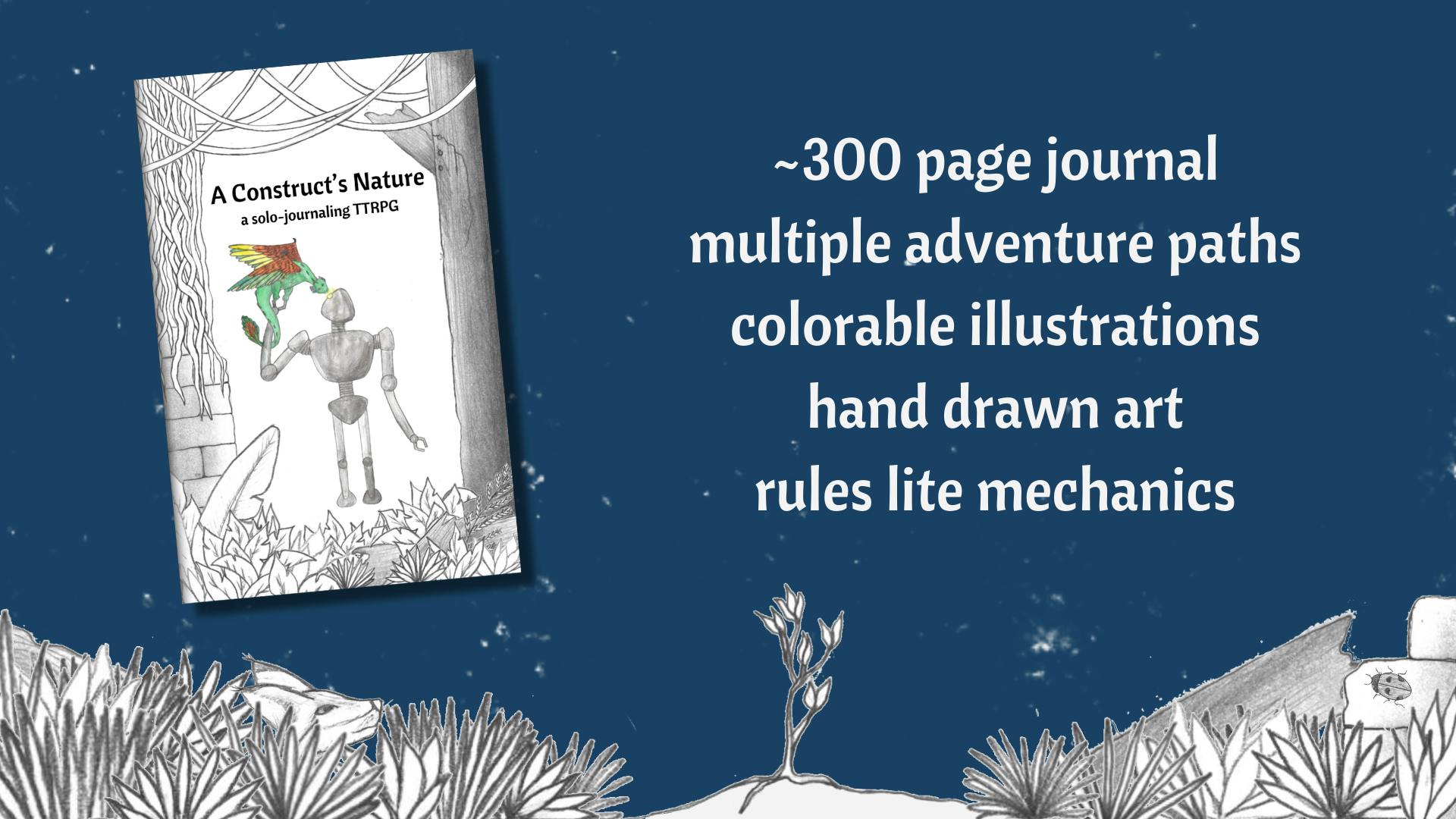 Born from a love of stories about robots, androids, and machines finding life and seeking meaning, A Construct's Nature is a solo-journaling TTRPG following the path of a newly awakened being in an overgrown world sparked with magic.