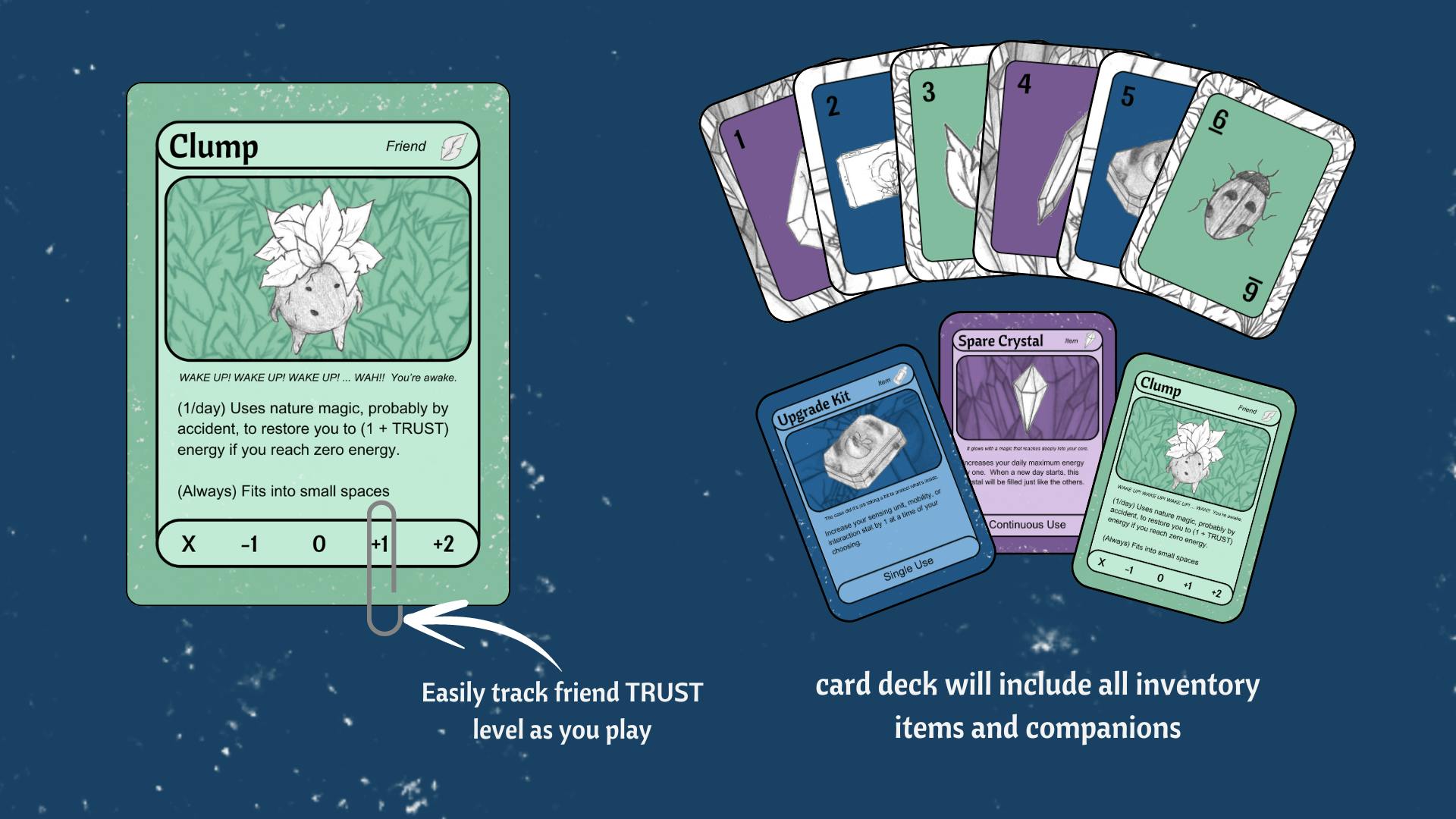 While I designed the character sheet to easily track your companions and your gear in one easy to reference location, I also know from experience that I am much more likely to use and ineract with game elements if I have a tangeable representation of them. Because of this, an optional card deck is available that will help track your friends (and their fluctuating trust) and your inventory.