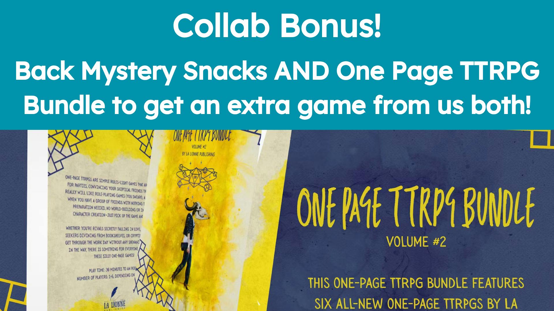 Check out our partner project too! If you back both Mystery Snacks AN One Page TTRPG Bundle during the funding period, you'll get a bonus 1-page TTRPG from us each!