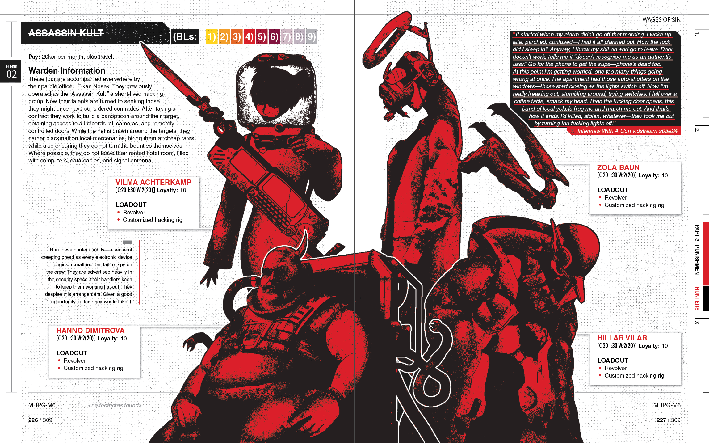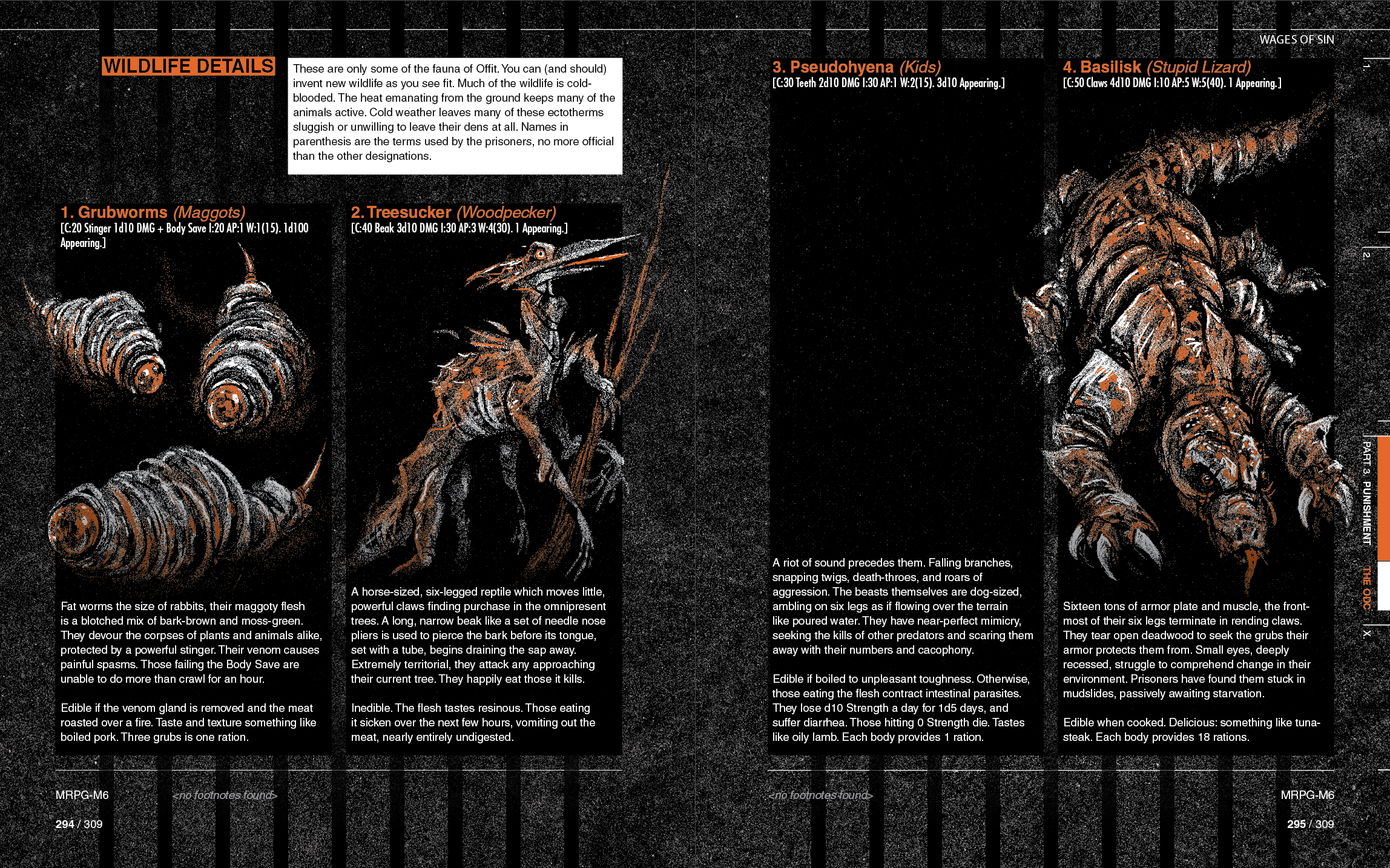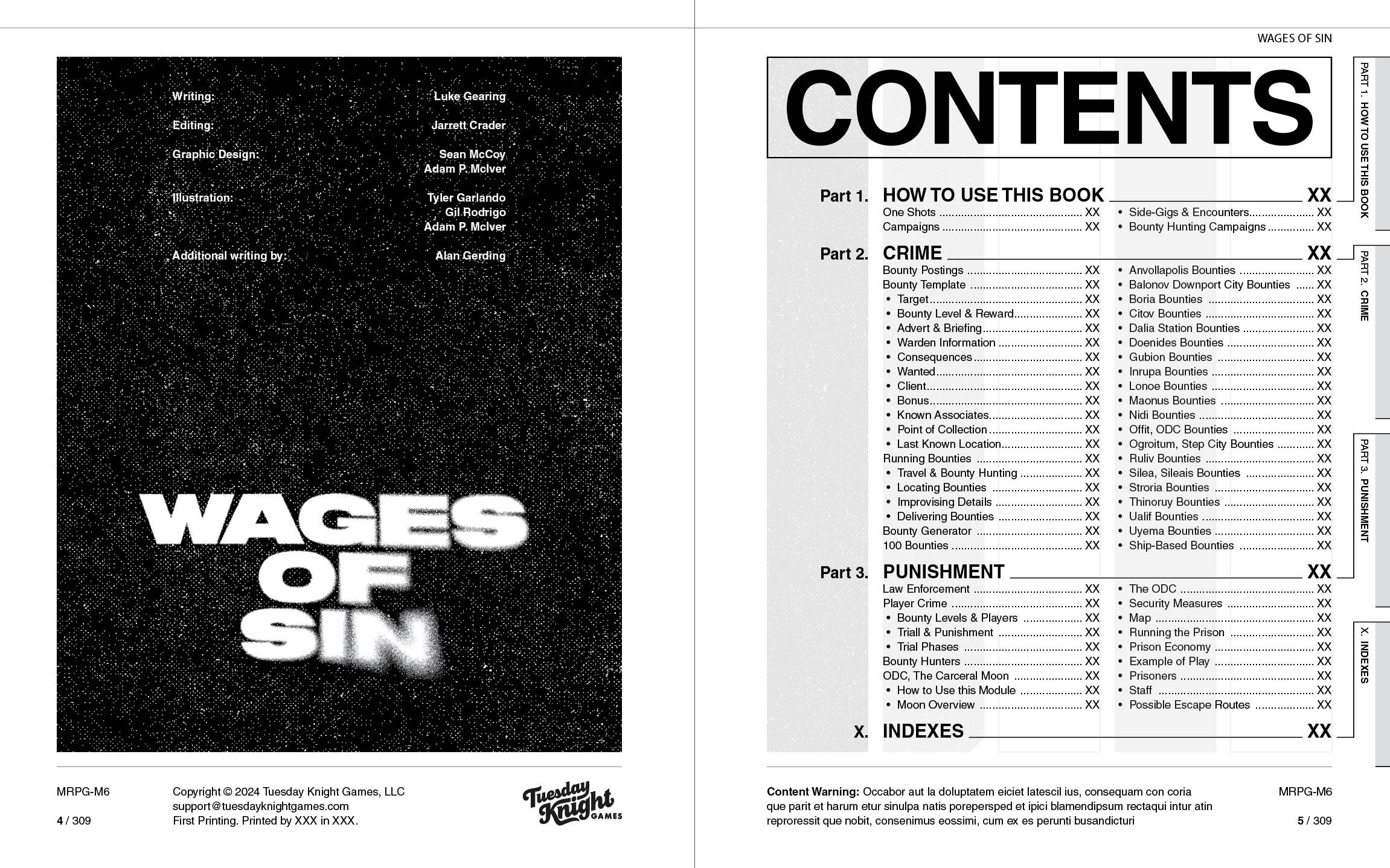 Right now, Adam is working on finishing up the layout. Adam just started with us late last year as our Creative Director and he is doing just a phenomenal job on Wages. This book is massive. It's clocking in at just over 300 pages right now. And he's made it so easy to navigate, and so fun to read. Aside from just how much content there is, I feel like this book really will stay right next to the Warden's Operations Manual in most Warden's games. There really is just so much content there.