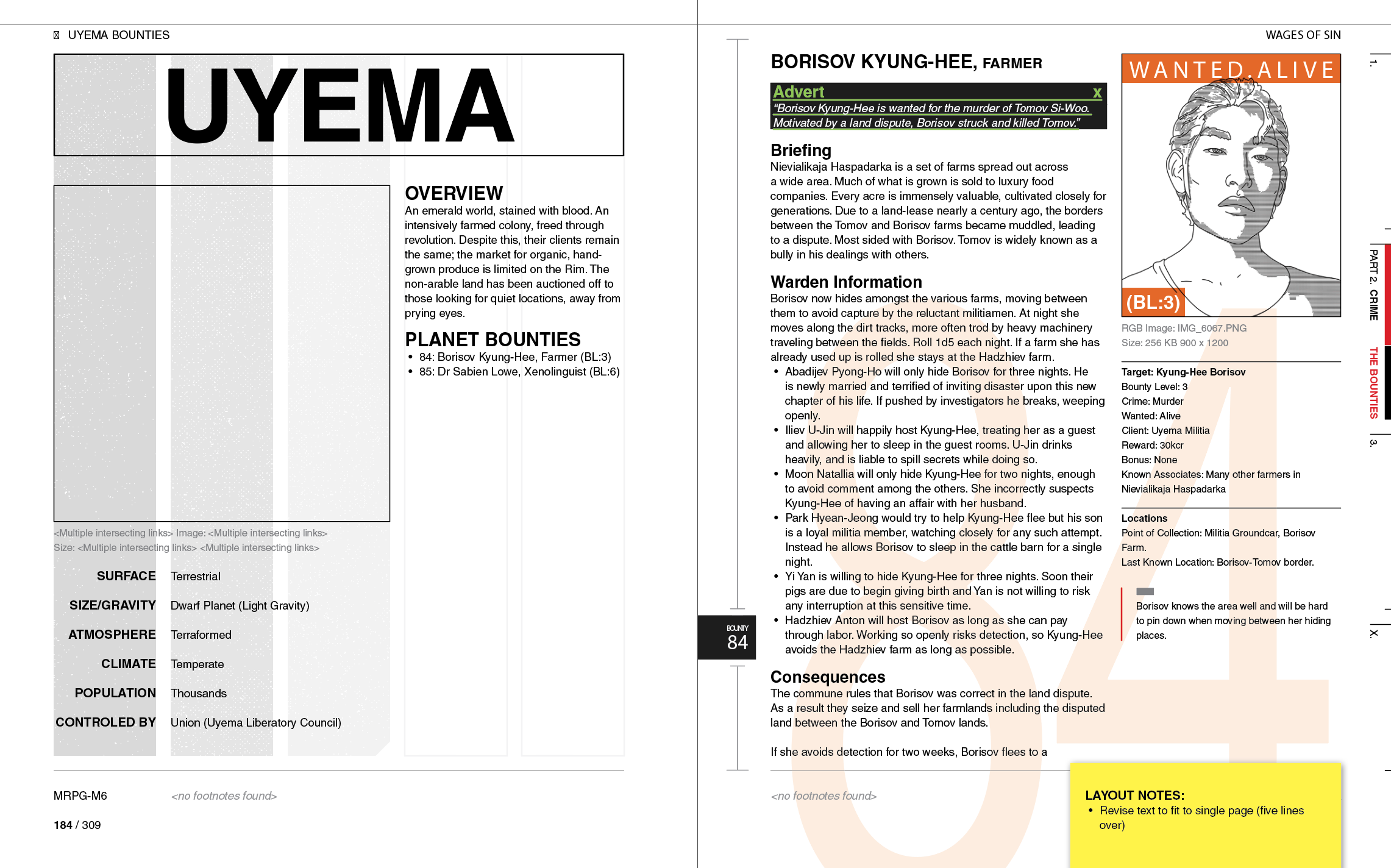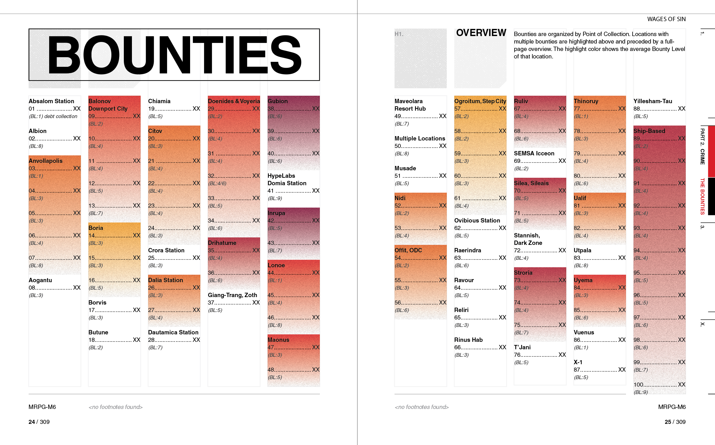 What's cool though is that every location is now getting a summary page. So you're not only getting 100 unique bounties, you're also getting almost fifty fleshed out locations to run your games from. Right now Luke is writing up all this new location data to fill these pages with useful info on the all the locales and factions and relevant NPCs you might find alongside the bounties.