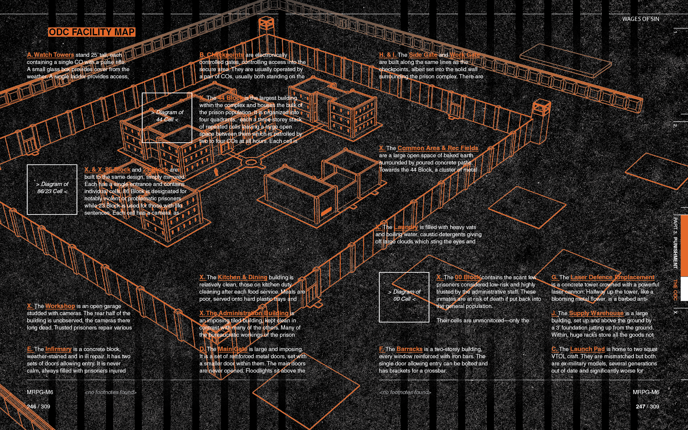 After that we've also got 10 bounty hunters to hunt your players down (or be hired???). We've done these up like expanded Unconfirmed Contact Reports entries and we've really focused on using them as horrors rather than just run of the mill contractors. It's a bad time when they show up. Your players will be afraid of them. The ODC prison complex is a sixty (60!!) page prison adventure at the back of Wages. We go for a different layout style here and it's turning out just beautiful. What's cool about this adventure is that it's sort of like a sandbox location. You've got the daily routines of the prisoners, what the work and living conditions are like, we give you a new weekly turn procedure, and then set your players loose.