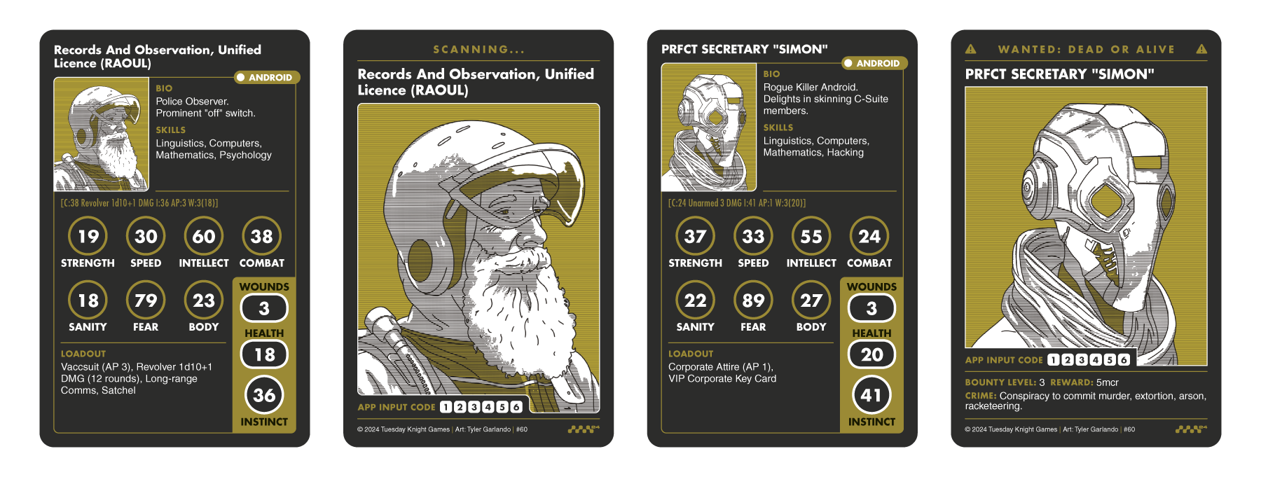 Oh! We've also done a new round of edits on the supply pod cards and they're looking great as well. These cards contain all the info you need to run these NPCs with a full piece of art on the front and all the stats on the back. We've formatted the stats in two ways in case you want to run them as PCs, which means players can just draw a card from the deck and start running them. Also, we've added an Input Code for the Mothership Companion App, so if your players want they can import the character directly into their app and start using them in the Companion's VTT or just keep the character with them wherever they go. We're super happy with these and we think we're going to keep doing them every year.