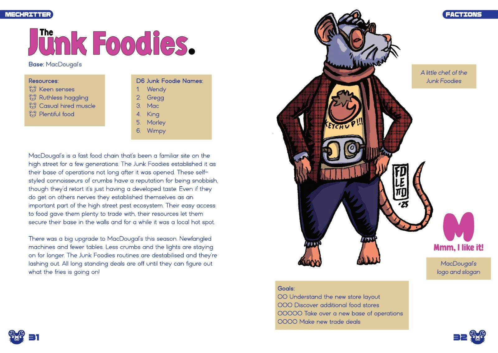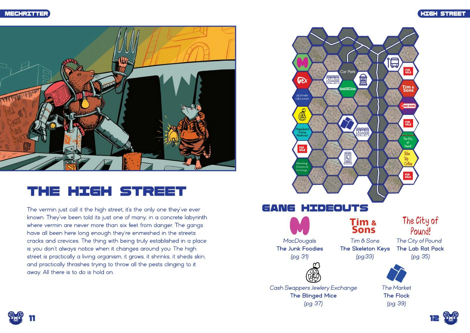Kayla has also put together layout demonstrations with Gustavo’s art. These show off some of the factions in the game, which are all centered around different shops on the high street.