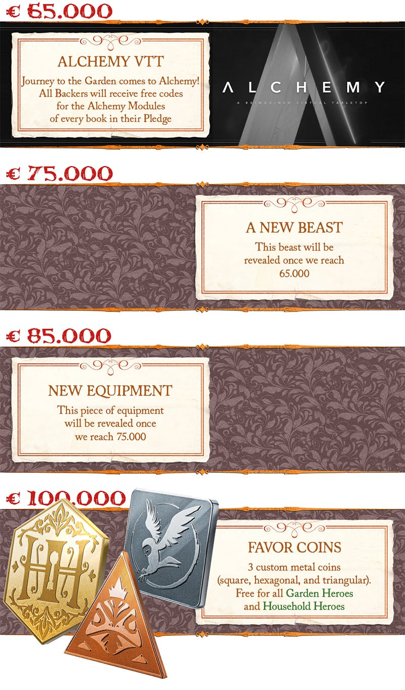 65.000 -ALCHEMY VTT: Every Backer will receive a free code to access the Alchemy Module of every book they've got in their Pledge Level (physical or PDF). So if you are a Household Hero, you will receive ALL the Alchemy Modules. If you are a Garden Hero, you will receive all the new ones, and so on.