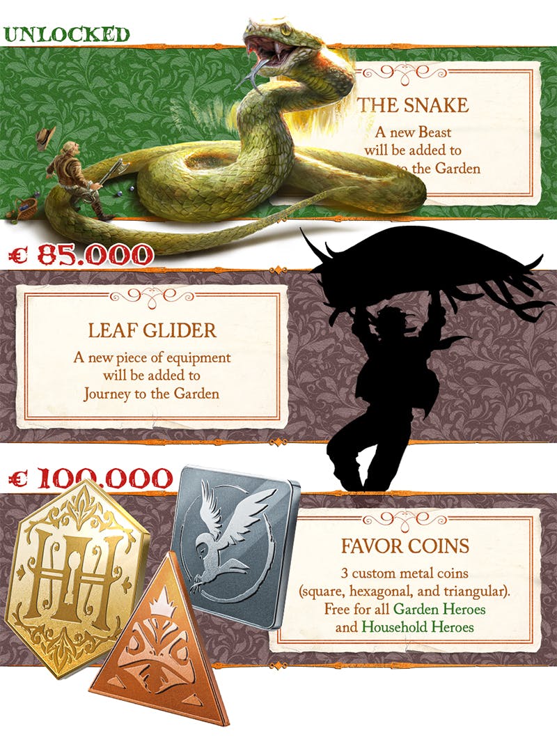 100.000 -FAVOR COINS: If we reach 100k, we will add 3 METAL COINS to every Household Hero or Garden Hero pledge levels