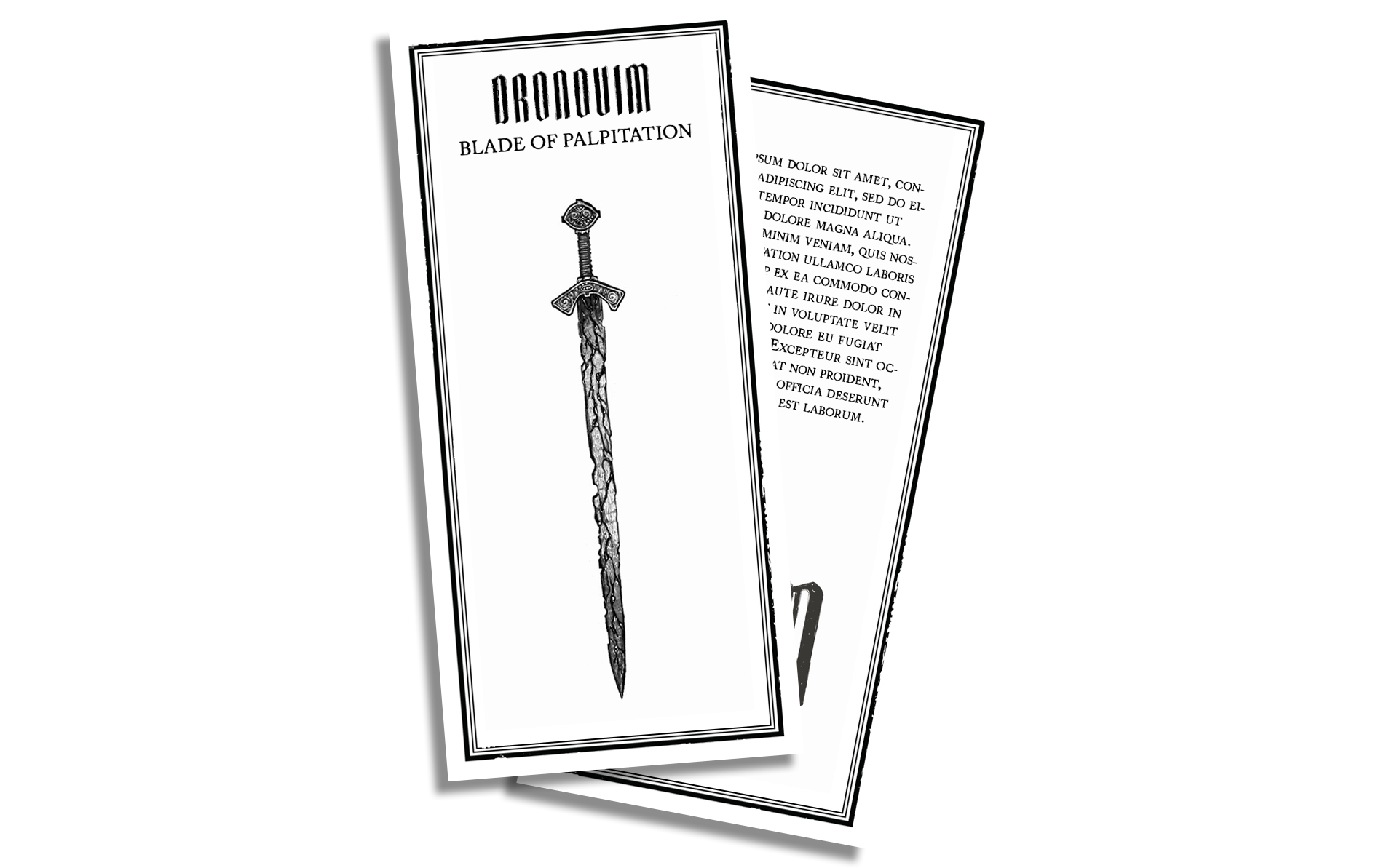 DRONOVIM - Blade of Palpitation: Imprisoned in this ancient sword there is the spirit of a Prince of Flesh. This blade was crafted with pulsing living metal, and is horribly perfused by pitch black veins. Anyone wielding this blade rolls one additional black die while attacking. They also suffer 1 Blood Corruption whenever they deal damage to a target.