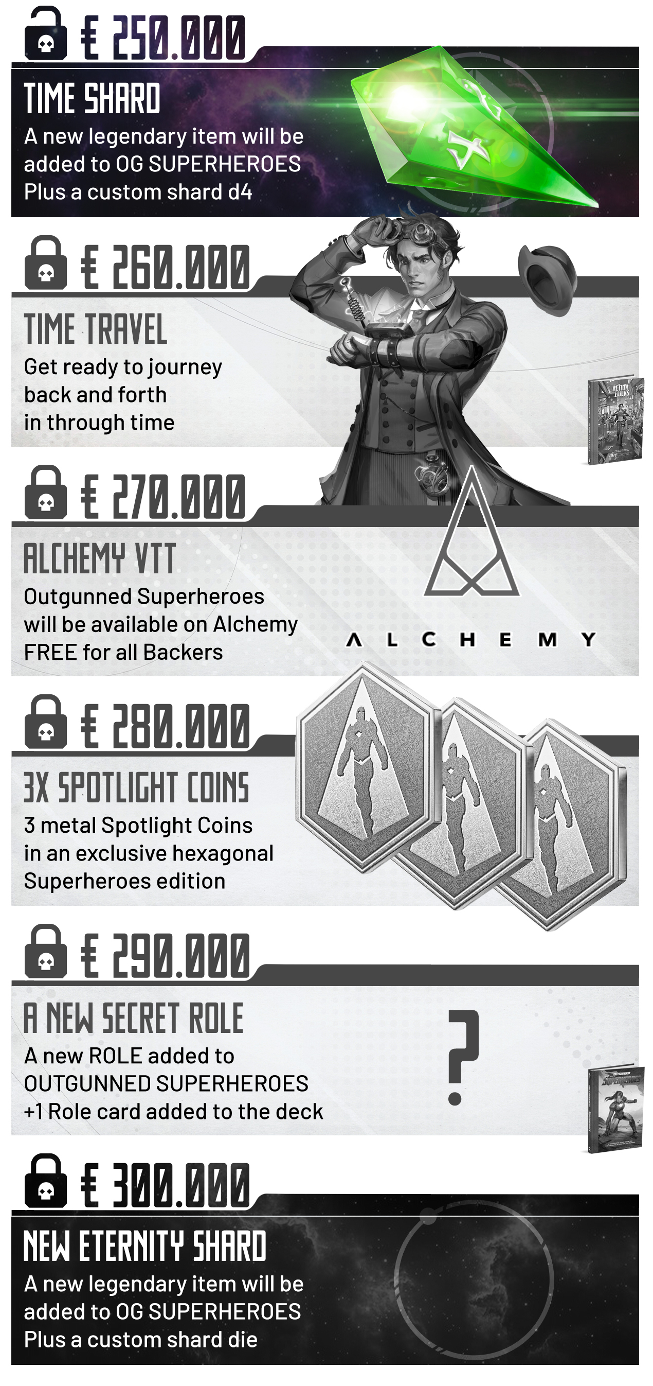 At 2.700% Outgunned Superheroes will became an official module on Alchemy, and it will be FREE for all Backer at any pledge level. MIGHTIEST HEROES will also get FREE access to all the existing Outgunned modules on Alchemy!