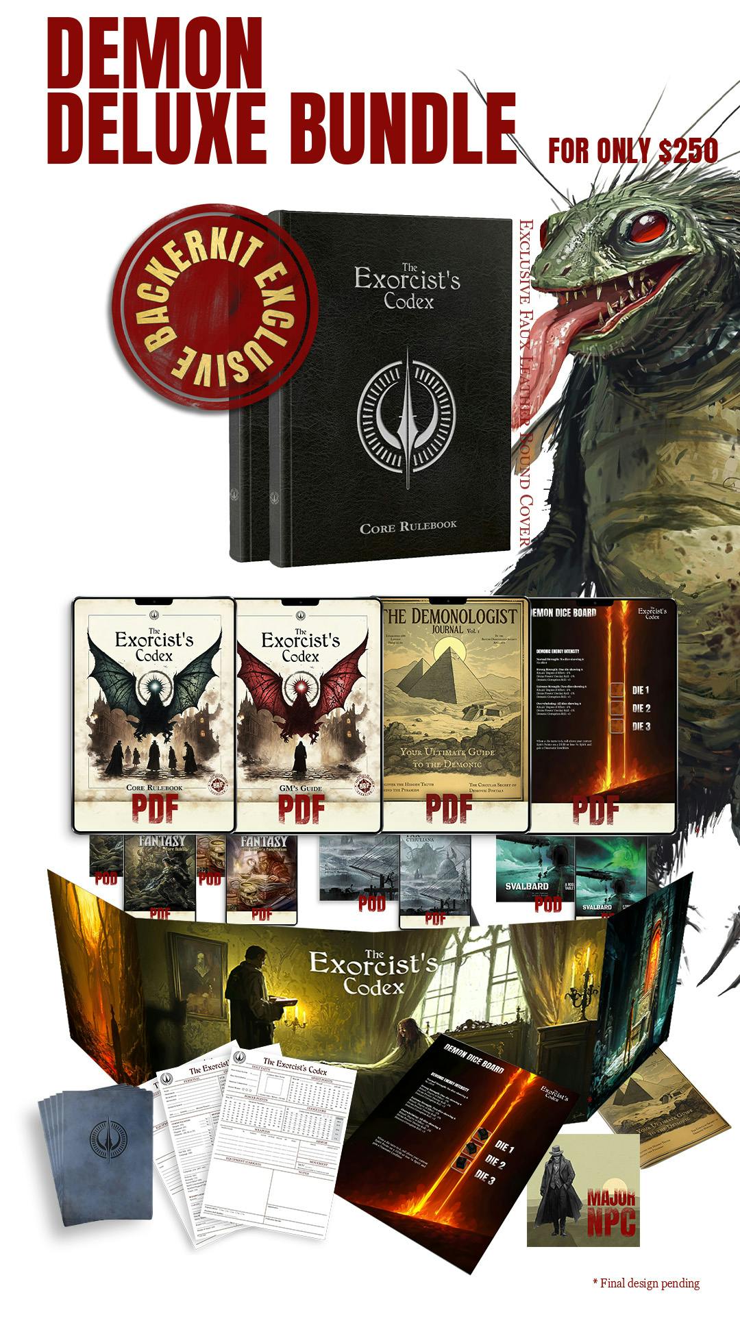 For those who want it all! This pledge gives you everything this campaign has to offer (except the Charged Talisman) along with exclusive content bundled only in this tier! You’ll receive a Deluxe Edition of both the Core Rulebook and GM Guide, bound in exclusive faux leather, 15 premium-quality character sheets, a stack of beautifully designed notebooks, a GM screen, a printed Demon Board, a beautiful slipcase, free entry in The Demonologist’s Journal Vol. 1, the chance to create a Major NPC, and a library of former titles from Two Starving Gnolls. Exclusively offered during this campaign and will not be available in stores! This is a seriously demonic bundle!
