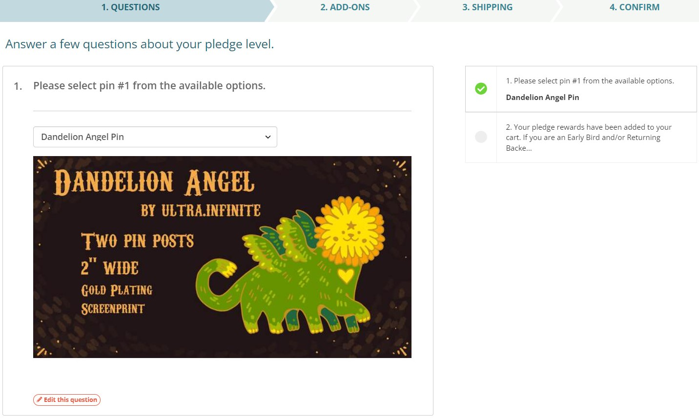 The first part consists of survey questions: where you answer survey questions depending on your pledge level. In this example I have pledged for one pin and I select it from the available options in the dropdown menu. Only the Pride Angel designs shown on the campaign page will be available from this menu. If I pledged for two pins, I’d answer two questions with a selection, and so on.