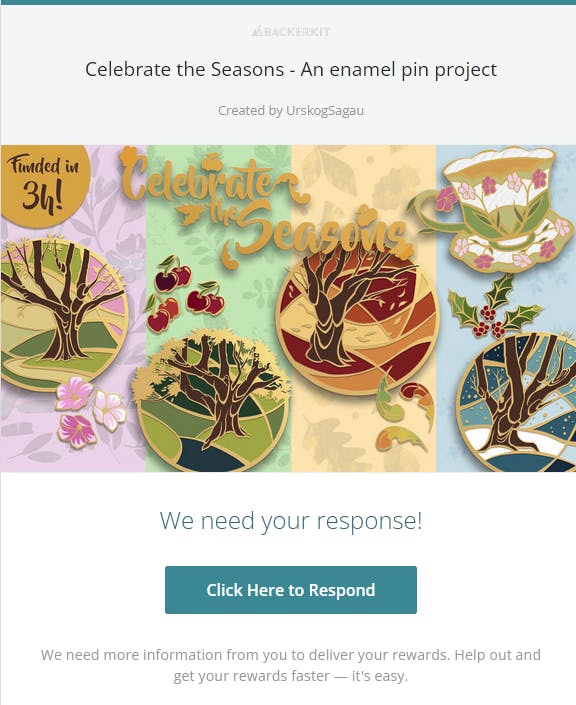 I'm already in the process of placing an order and checking the artwork with the manufacturer. I just need the final counts from the surveys. I'll be placing the order when 80% of you have filled in the surveys! So the sooner things are filled in, the sooner you get pins ;).