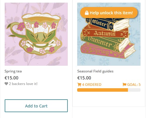 Survey add-ons: In the survey you can add additional items to your pledge! This includes all campaign-pins, but also existing pin designs, stickers & prints. The Spring Tea & Seasonal Field guides are also available! The Field Guides will be unlocked with 5 orders, we currently have already 4! from the smoke test, so I'm very confident that we will get there. In case we won't, I'll remove the add-on and you won't be charged for it.
