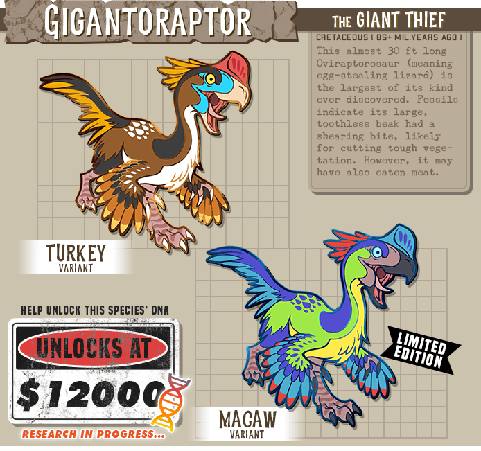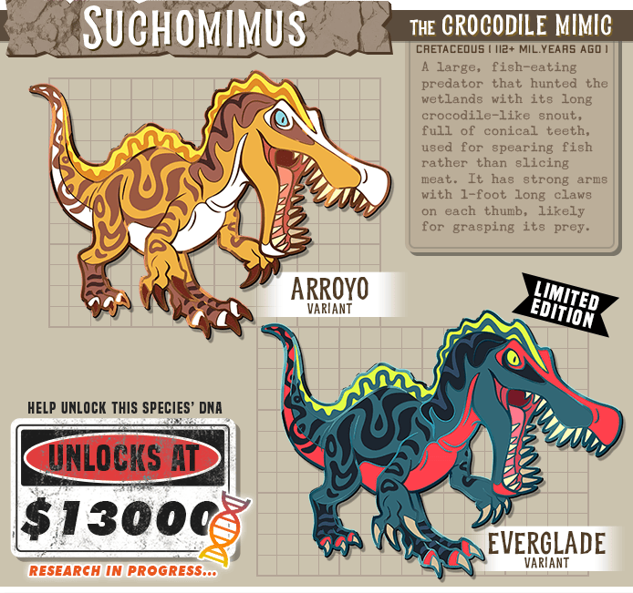 The giant egg thief Gigantoraptor! And the crocodile-like Suchomimus! These were the two runners-up in the poll, so they get the last two slots in this pin series! Fun fact: Suchomimus was reworked out of a Baryonyx sketch I did that I scrapped! They're very similar species!