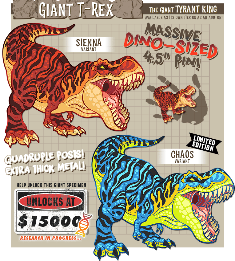 I've added a 15 pin tier, since 3 new regular-sized pins were added since the beginning of the campaign, and I've re-enabled the All-In tier which now includes the 6 new regular-sized pins, the 2 giant rexes, and everything else.