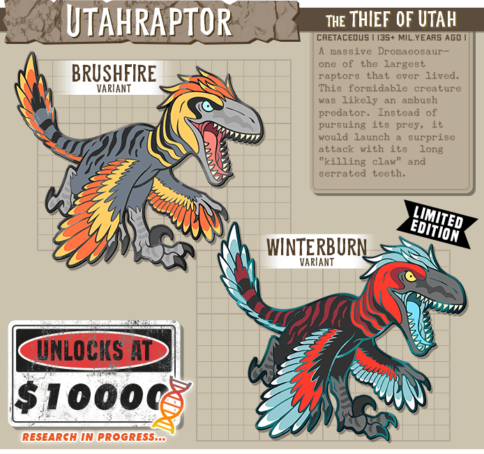 Another raptor joins the Jurassic Attack! roster! This bulky predator was (until very recently!) the largest Dromaeosaurid ever discovered. Much larger than even Deinonychus, this raptor would have been a fearsome sight! We have two striking colors: a fiery plummage and a blood-red coat with icy features.