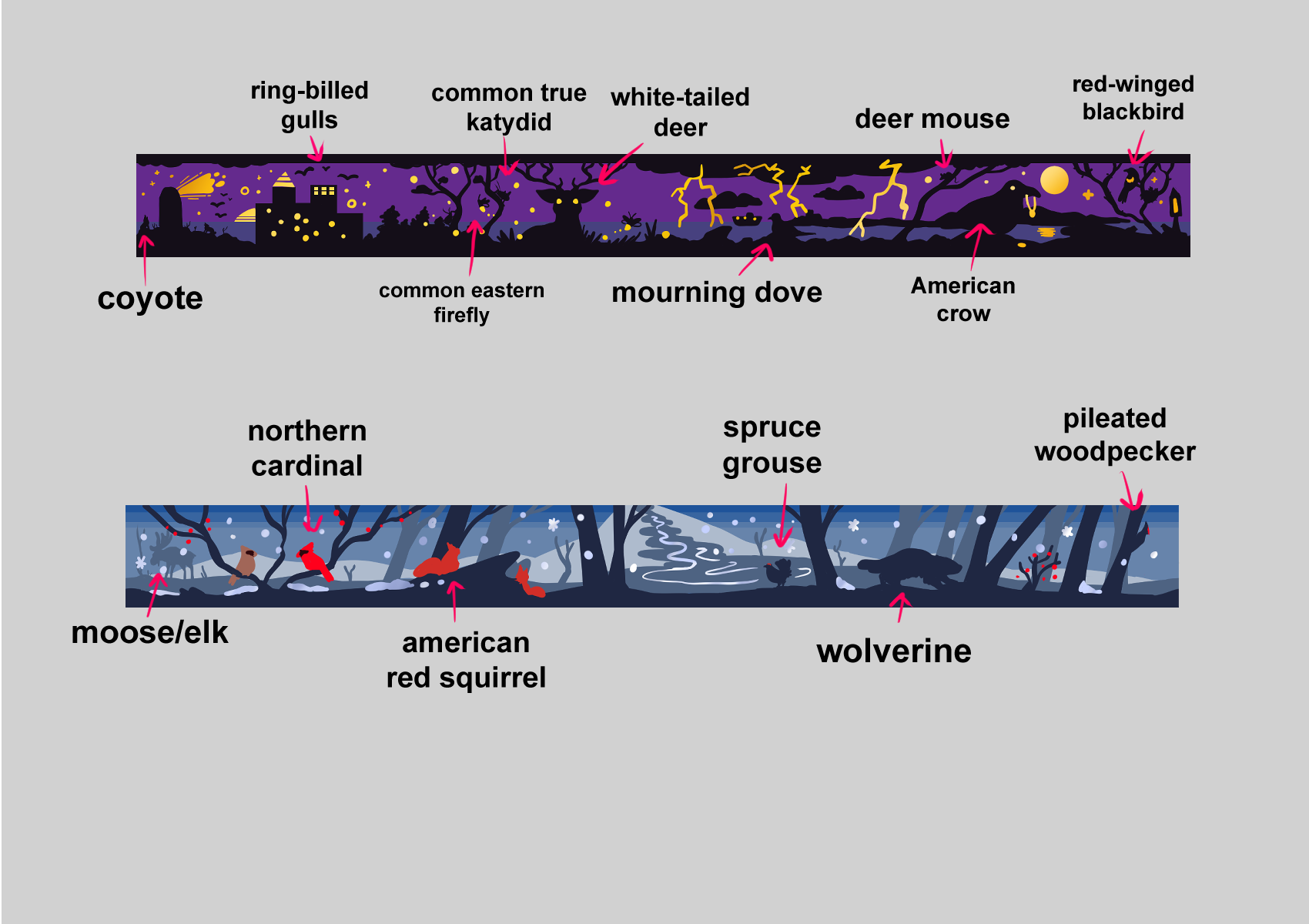 Here are the other foil washi tape designs with the animals labelled: The first is a shoreline scene which includes some more common animals. The second is a winter scene with some animals found in more norther regions. This one will have a silver foil instead of gold. And if anyone is wondering moose is labelled that way because the Eurasian moose, which is in fact the same species, is called an elk, and was the original species referred to as an elk. It's why I try to say wapiti to refer to the North American and Asian elk to avoid confusion.