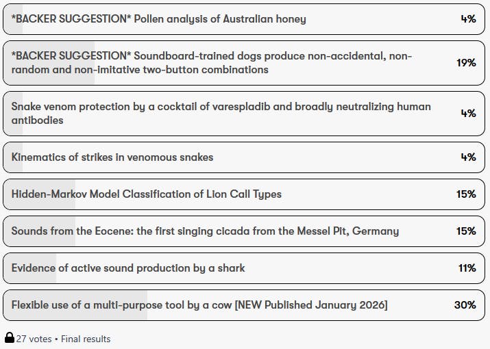 Flexible use of a multi-purpose tool by a cow [NEW Published January 2026] & *BACKER SUGGESTION* Soundboard-trained dogs produce non-accidental, non-random and non-imitative two-button combinations! Cows finally won, they were so close in so many polls; congratulations cow fans! I've taken the top two poll designs so I can work on the Soundboard Dogs in the next couple of days. Right now we're a mere $700 away from unlocking them, but who knows what will happen in the next 3 days! Should we break $8,000 that design will also be produced. That would mean ALL stretch goals would be unlocked for this campaign, as variants have already been added for multiple designs (see last update)!