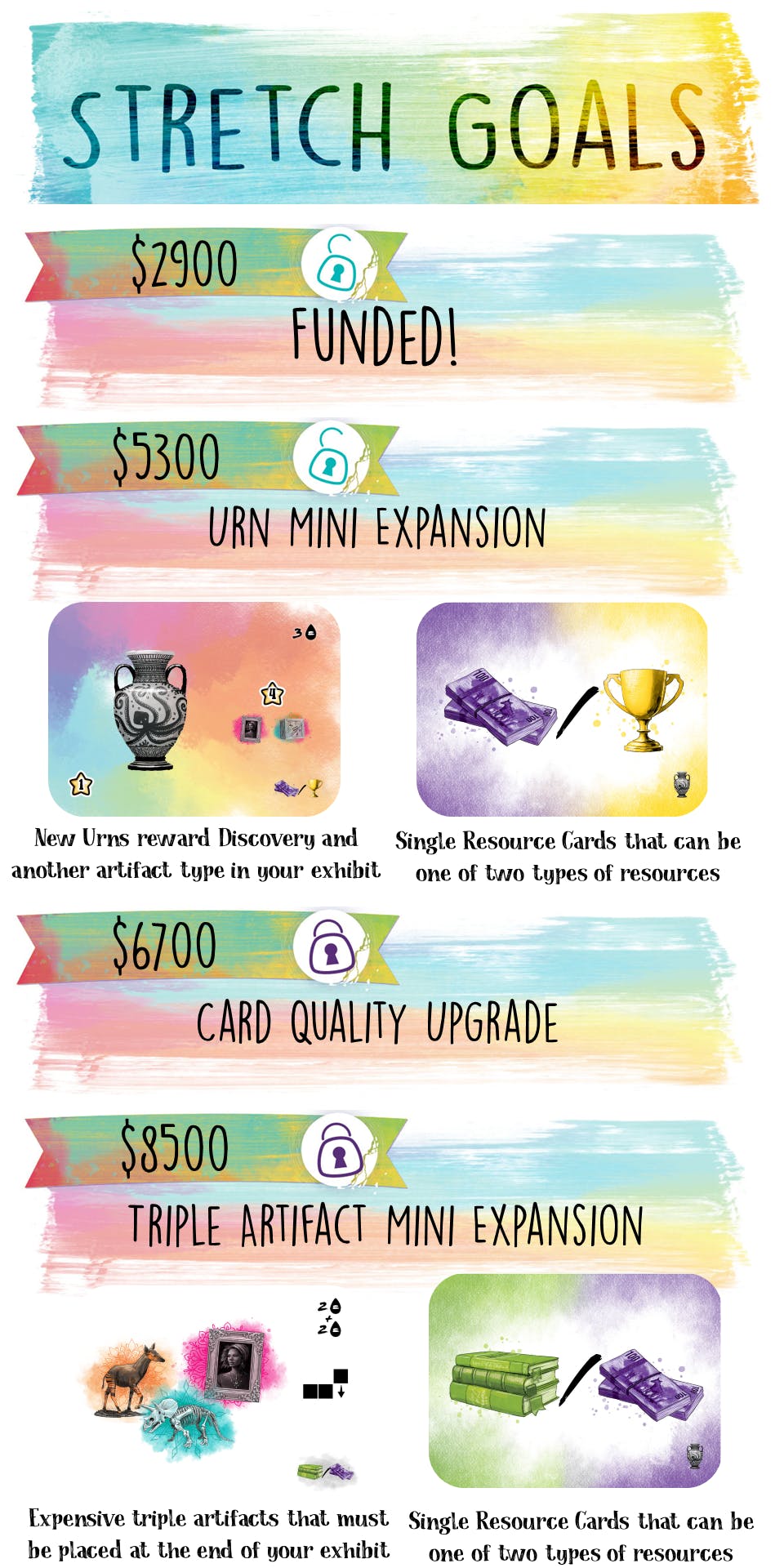 We've hit the first stretch goal since the last update, now there's another that's been added! This means that the Urn Mini Expansion will be added to all pledges with the physical game and there's a potential second expansion that could also be added. Plus, the usual card quality goal that I love adding as fancy cards makes for fancy card games. Now, for the triple artifact expansion... these card are super powerful, but also expensive and must go on the right end of your exhibit; you don't get a choice of where to place these artifacts like you do with other artifacts. Plus, the resource cards that are a choice of two, to make artifacts a bit easier to acquire.