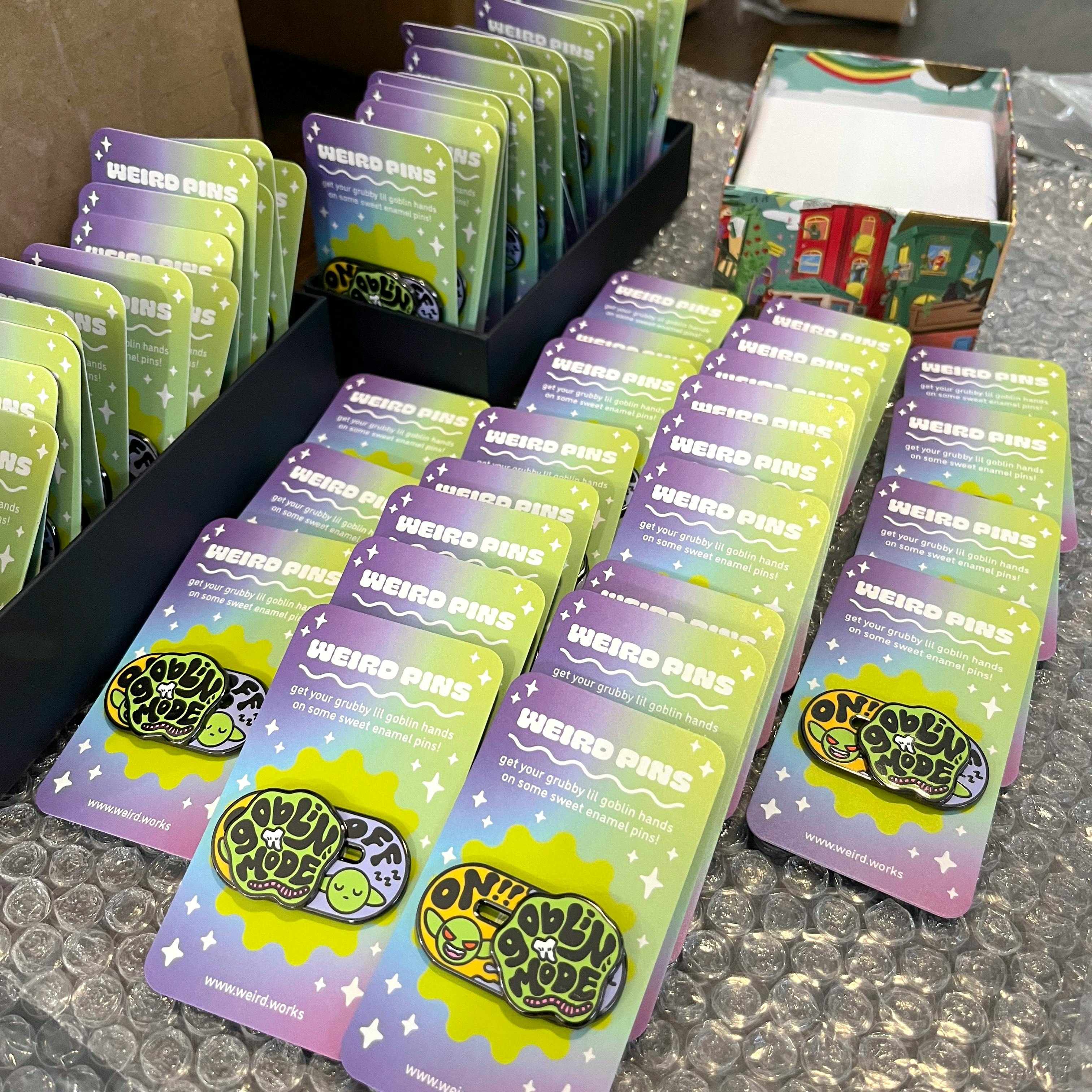 Today I sent the pin designs to our manufacturer, and we will be working together to make sure the pins turn out fantastic, especially our most popular pin, Goblin Mode! The colors when printed will be a tad different, but I did my best to match the RGB colors with corresponding Pantone colors.