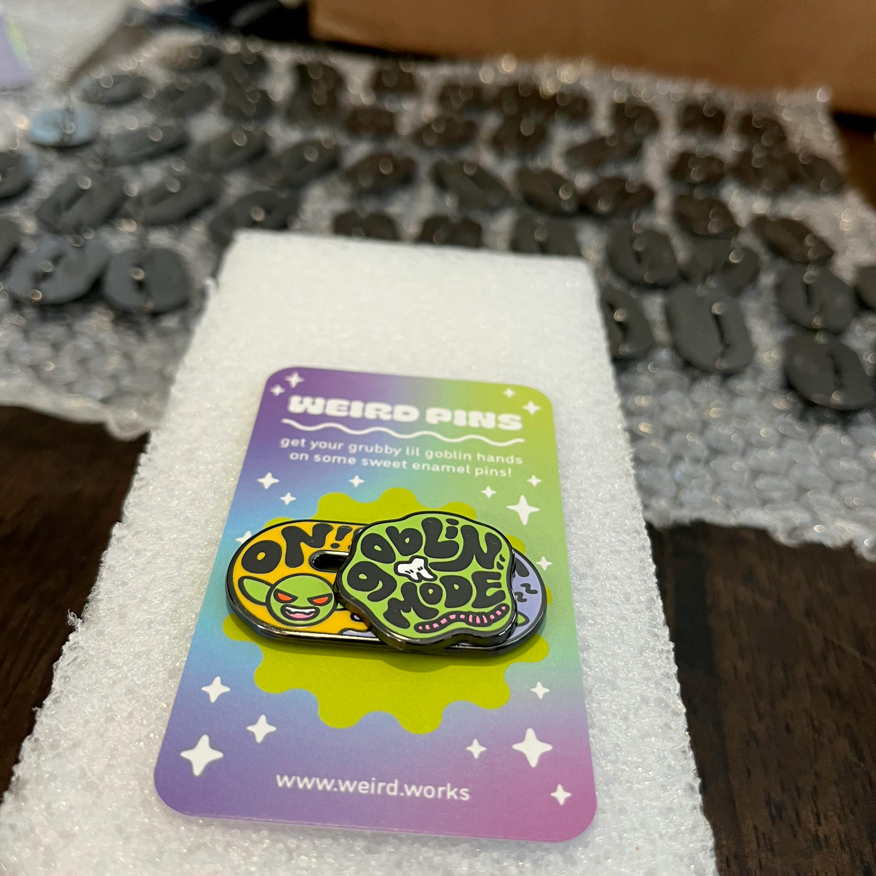 We just got the pin samples from the factory, so here is an update! As you might be able to see, there are a few defects we are trying to work out with the factory. The goblin in Farting is Wild Magic seems to have some speckles in them, which is not intentional (as far as I am concerned). The hands in Ponder This all have a weird mark on them that seems to be uneven enamel. And the Goblin Mode part of the sliding pin is a little higher than I wanted, so I am asking our manufacturer if they can move them down a millimeter or two. Other than that, the pins are looking great! Here is the spread with all of them, and more shots down below.