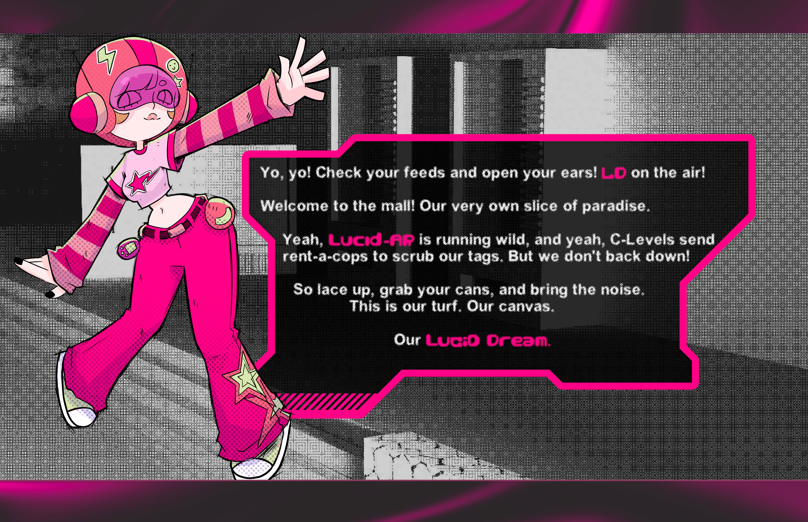 Prospero's Mall & Outlet failed project is being consumed by its own Lucid-AR tech. Street crews fight back with graffiti, skating, and style, keeping the holo-horrors at bay.