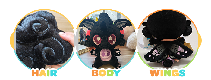 Left/"Hair": Side view of hair embroidery | Middle/"Body": Monty! | Right/"Wings": Wing design