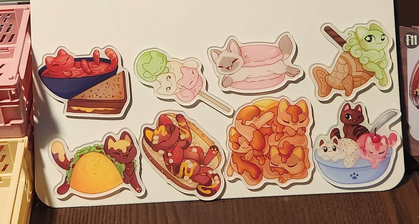 (On the left we have my acrylic order that also contains the acrylic magnets with a guest appearance of my cat Kirby, on the right the jelly bean cat sticker sheets, and below the magnets!