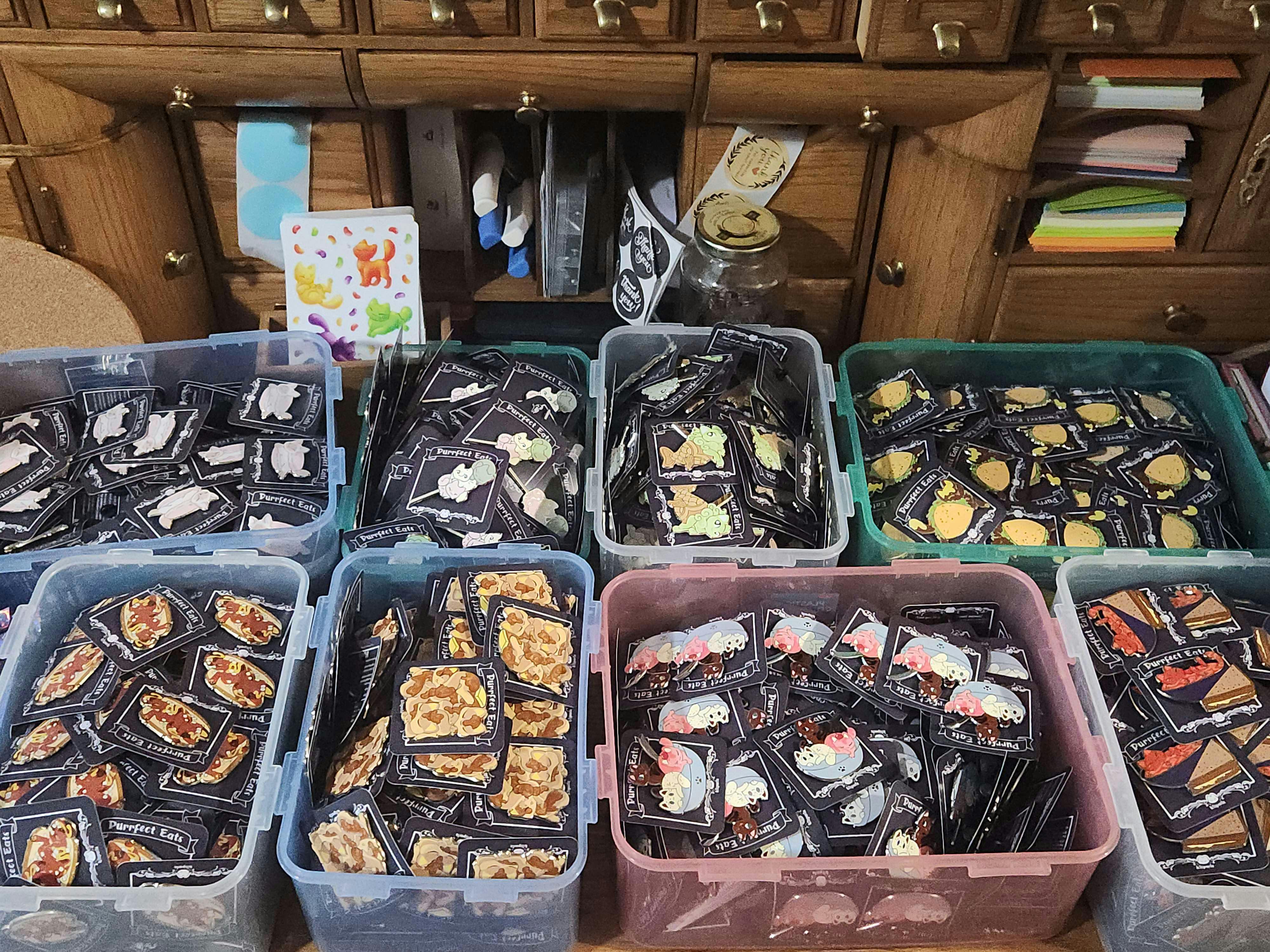 The unfortunate kicker though, is that I will be out of town a lot of the first half of July due to travelling for conventions (If you'll be at Anthrocon in Pittsburg, PA, or Kitsunekon in Green Bay, WI come say hi!). While I should be able to get a chunk of them shipped out in-between the events when I come home to restock before heading off to the next event, it wont be all of them, so some packages may not ship until mid July after Kitsunekon! I was hopeful I could get them out before my July events but it being my first fundraising project and my first backerkit project I didn't realize the different things needing to be set for surveys, locking orders, charging shipping, locking addresses, etc would add so much extra time. But! It allowed me to check all the pins needed for fulfilling orders so once I'm ready to pack, I'll be ready to get them packed quick!