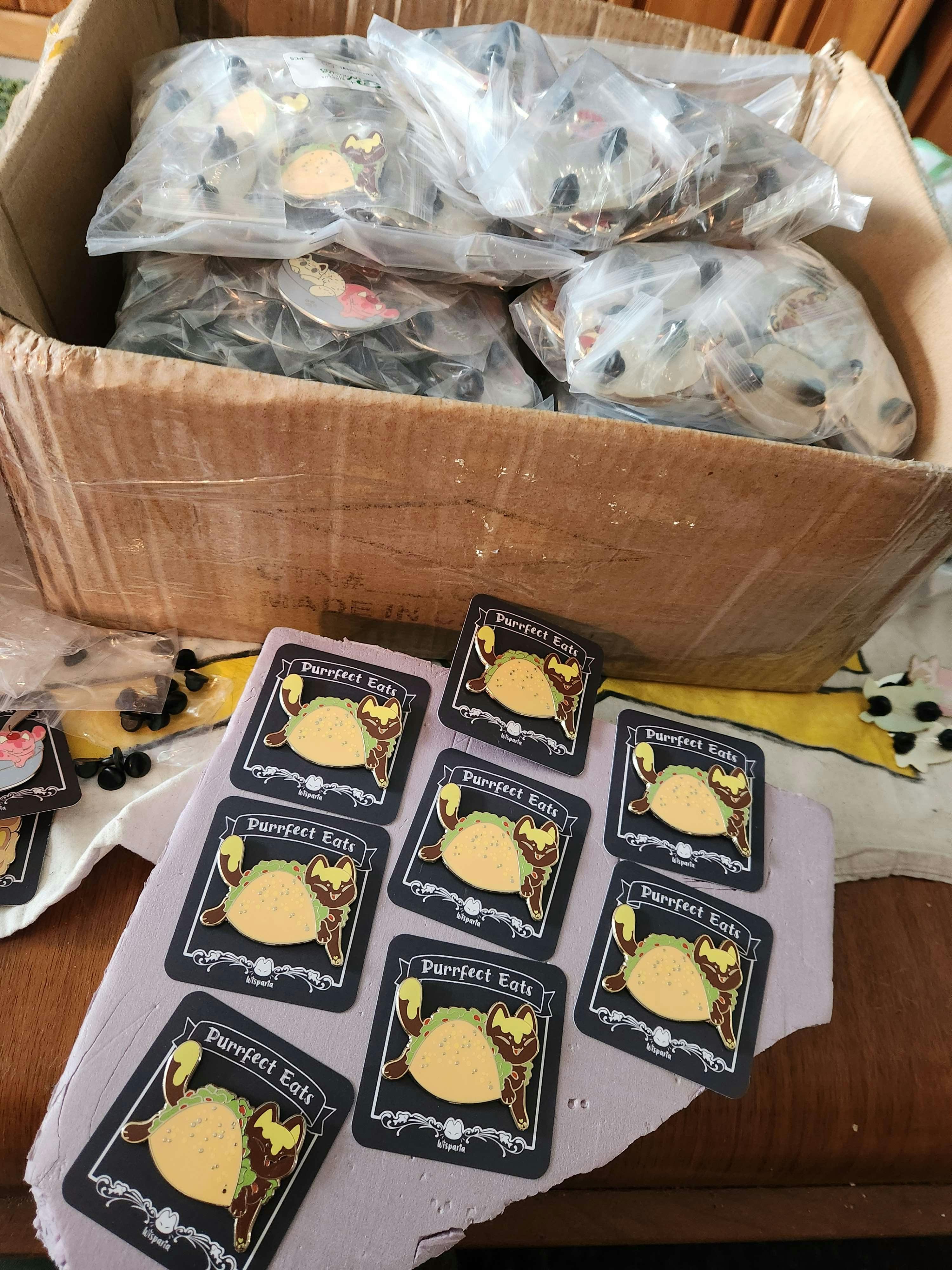 The most exciting news, the pins are done! They've already been shipped from my manufacturer to me and will be in my hands shortly! There were a few flawed ones that my manufacturer found and were kind enough to work on those while shipping out the rest to me so I can get started on checking em all, putting them on their backing cards, and getting all the orders packed!