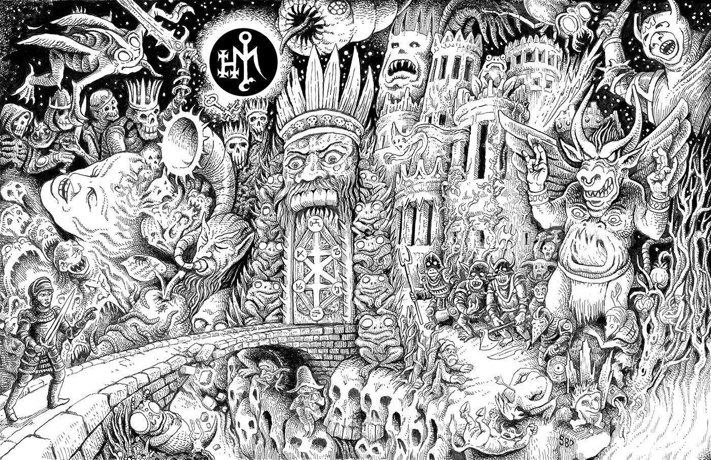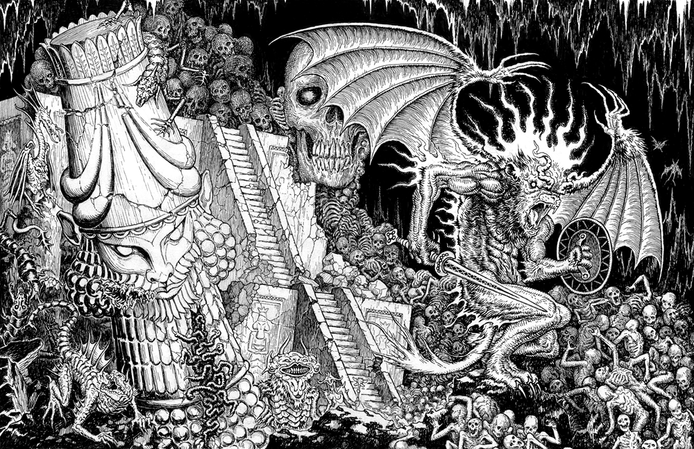 Many of those artists are contributing monster drawings as well, but none more so than the astonishing Jota Cravo. Jota, a veteran of Mothership, Exalted Funeral, and many a Metal band, is providing over a dozen pieces, some shown below.