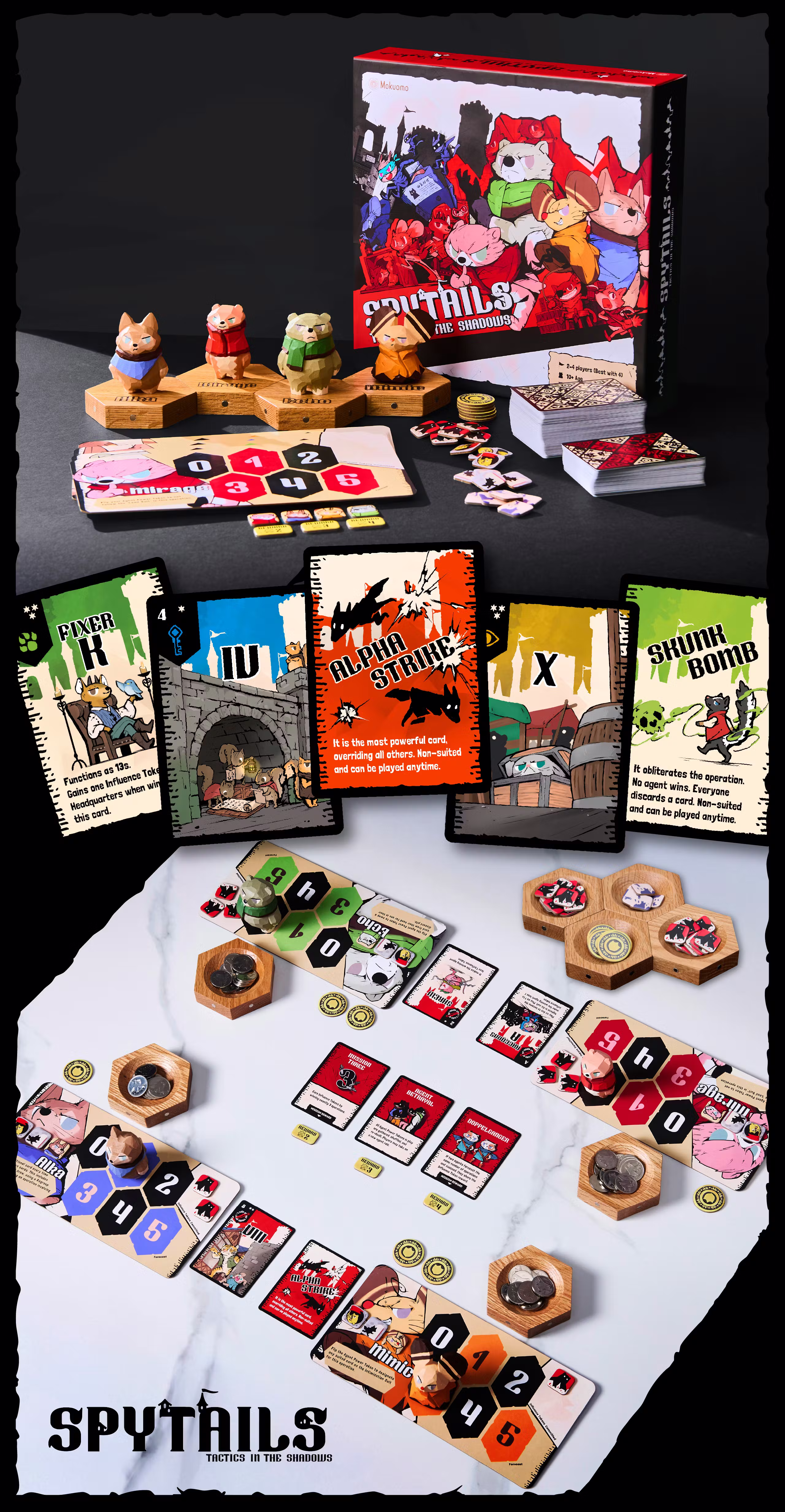 Spytails is a trick-taking game that combines deck-building mechanics with a fun spy theme, wooden components, and lots of personality. It is quite different from our previous projects, but it still carries the same care and love for design that we always strive to bring.